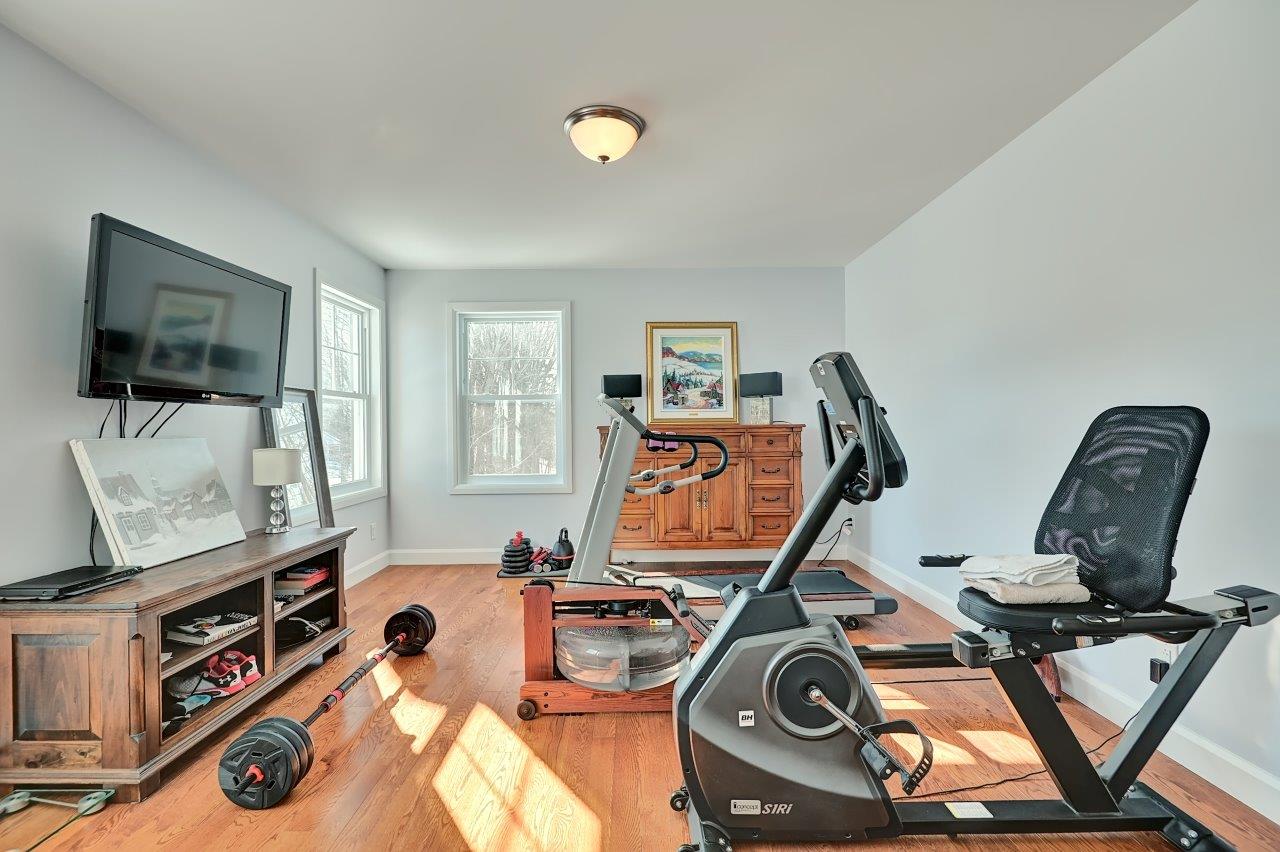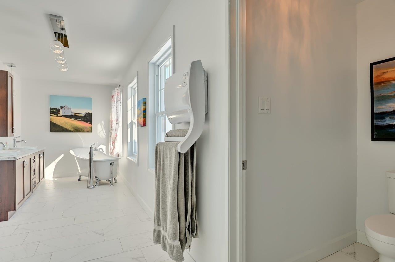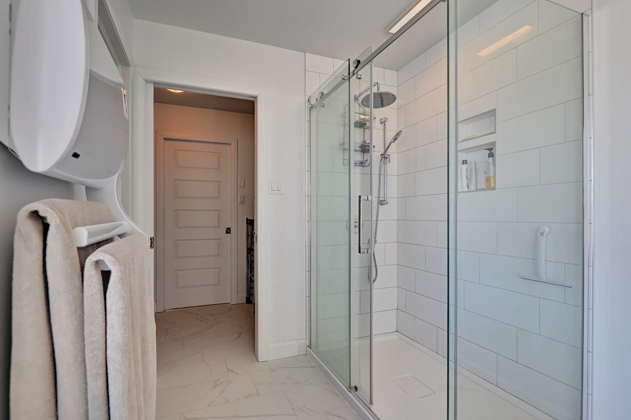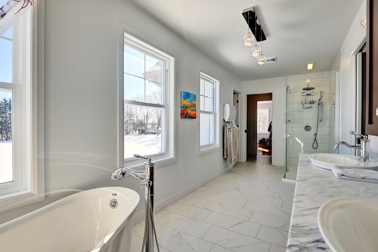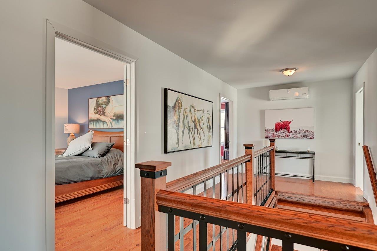 À l’étage, deux chambres spacieuses avec walk-in, une salle d’entraînement et une salle de bain complète vous attendent. Celle-ci offre un confort absolu : planchers chauffants, chauffe-serviettes, bain et douche séparés, toilette fermée et salle de lavage indépendante.