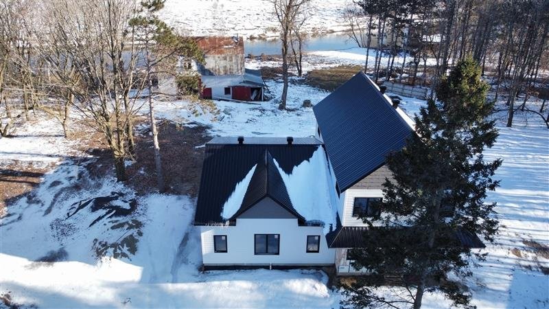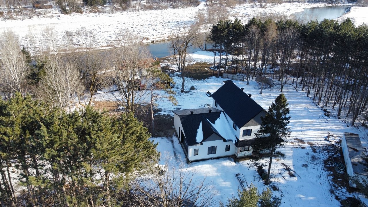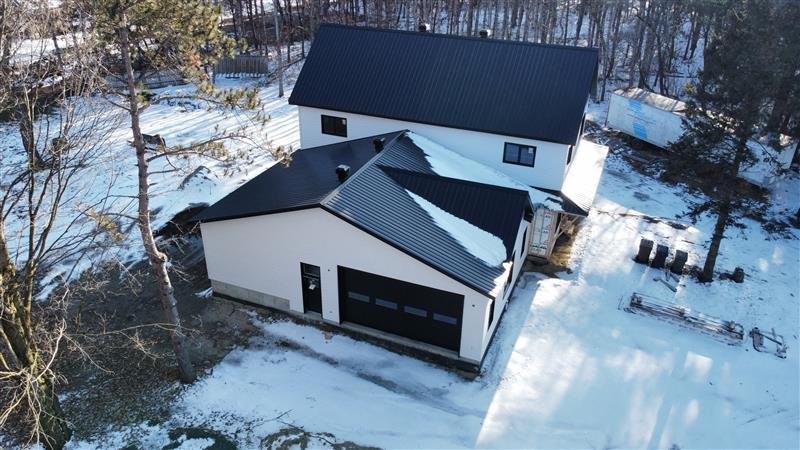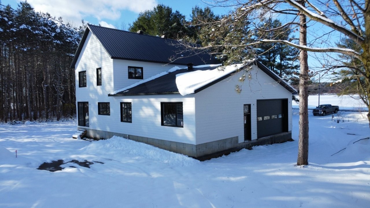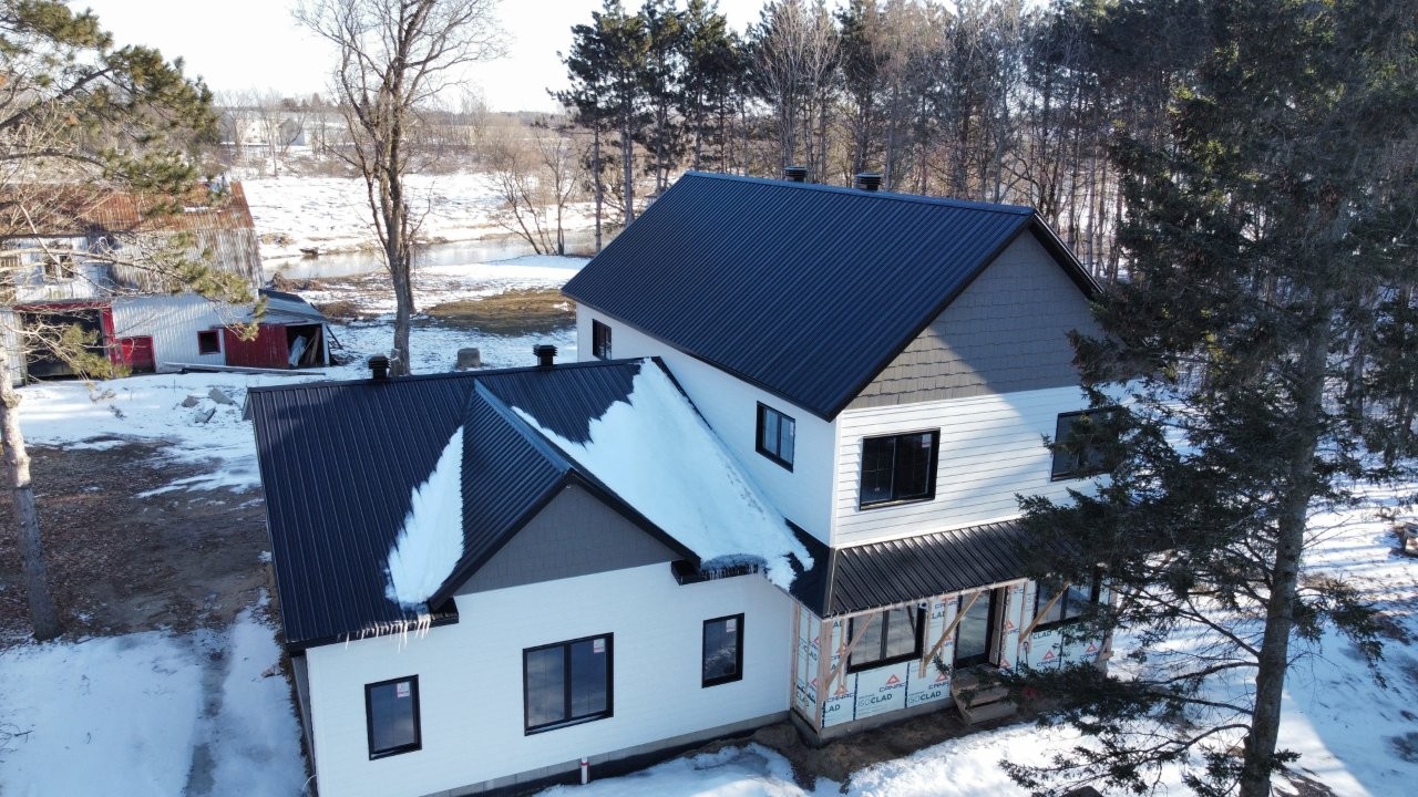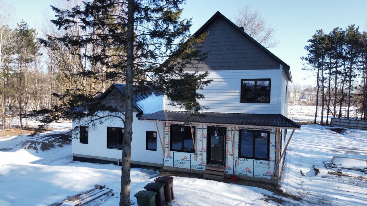 La qualité des matériaux se démarque par une généreuse fenestration avec cadrages en aluminium, une toiture en tôle durable et un revêtement extérieur de bois d’ingénierie SmartSide. Un drain français neuf muni de regards entoure la résidence pour assurer une gestion optimale des eaux. Il ne reste plus qu’à fermer les murs et procéder aux finitions pour donner vie à cette maison de campagne en construction moderne.