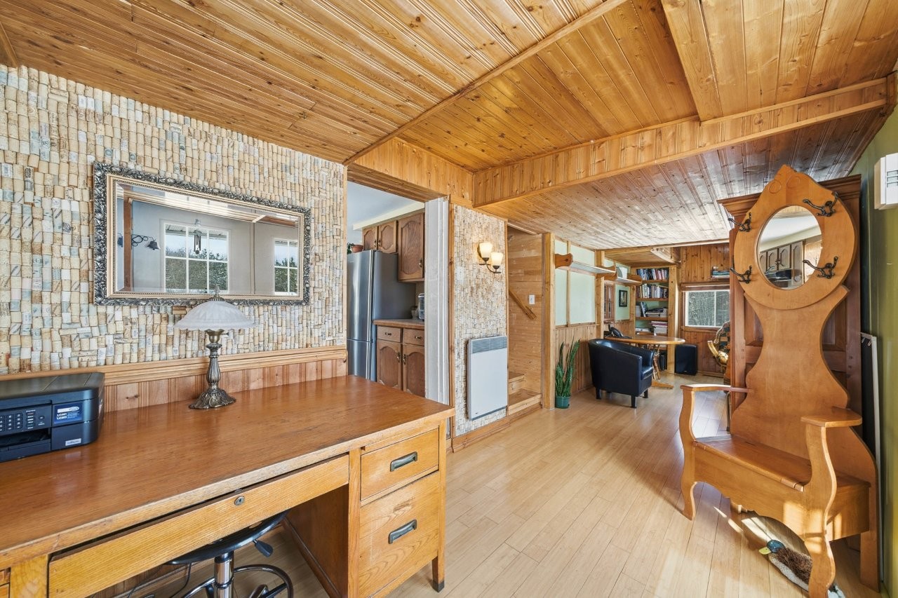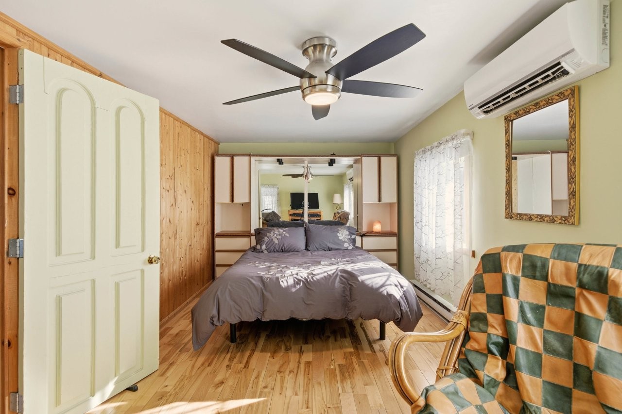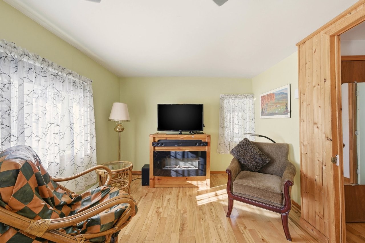 La maison, relocalisée sur de nouvelles fondations en 2005, a fait l’objet d’un entretien constant au fil des années. Elle offre une atmosphère conviviale et accueillante, avec trois chambres, une galerie idéale pour apprécier la vue sur la propriété, ainsi qu’un sous-sol proposant diverses options d’aménagement selon vos projets : espace familial, salle d’entraînement, bureau ou rangement additionnel.