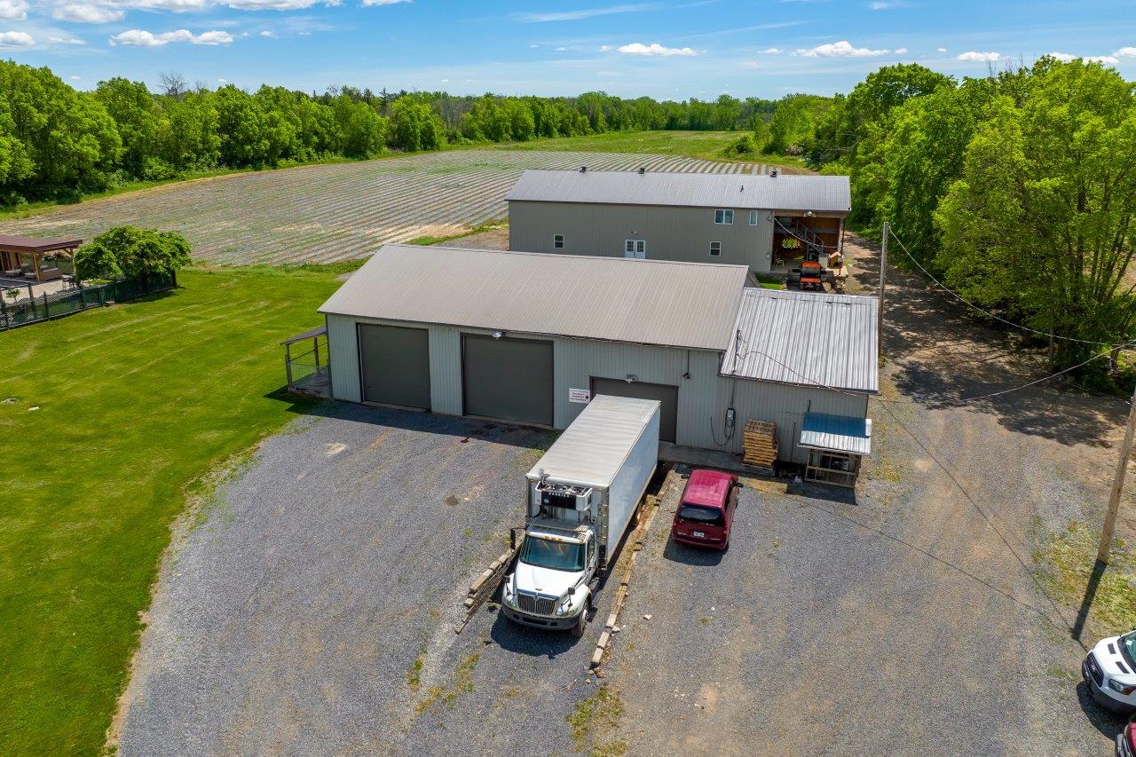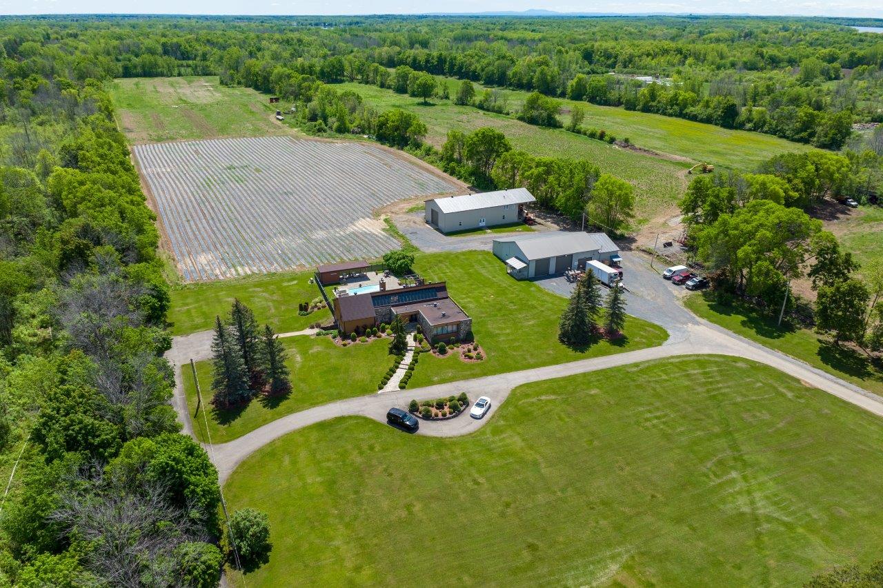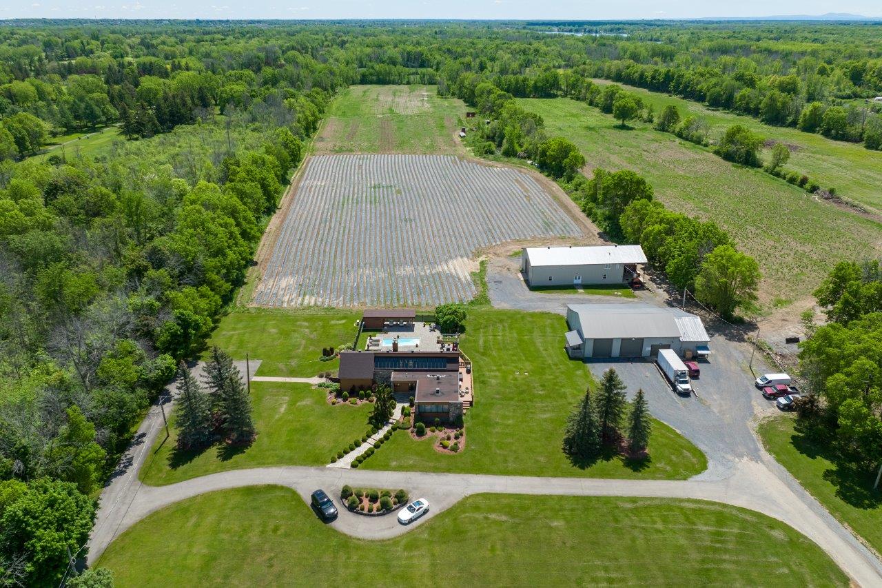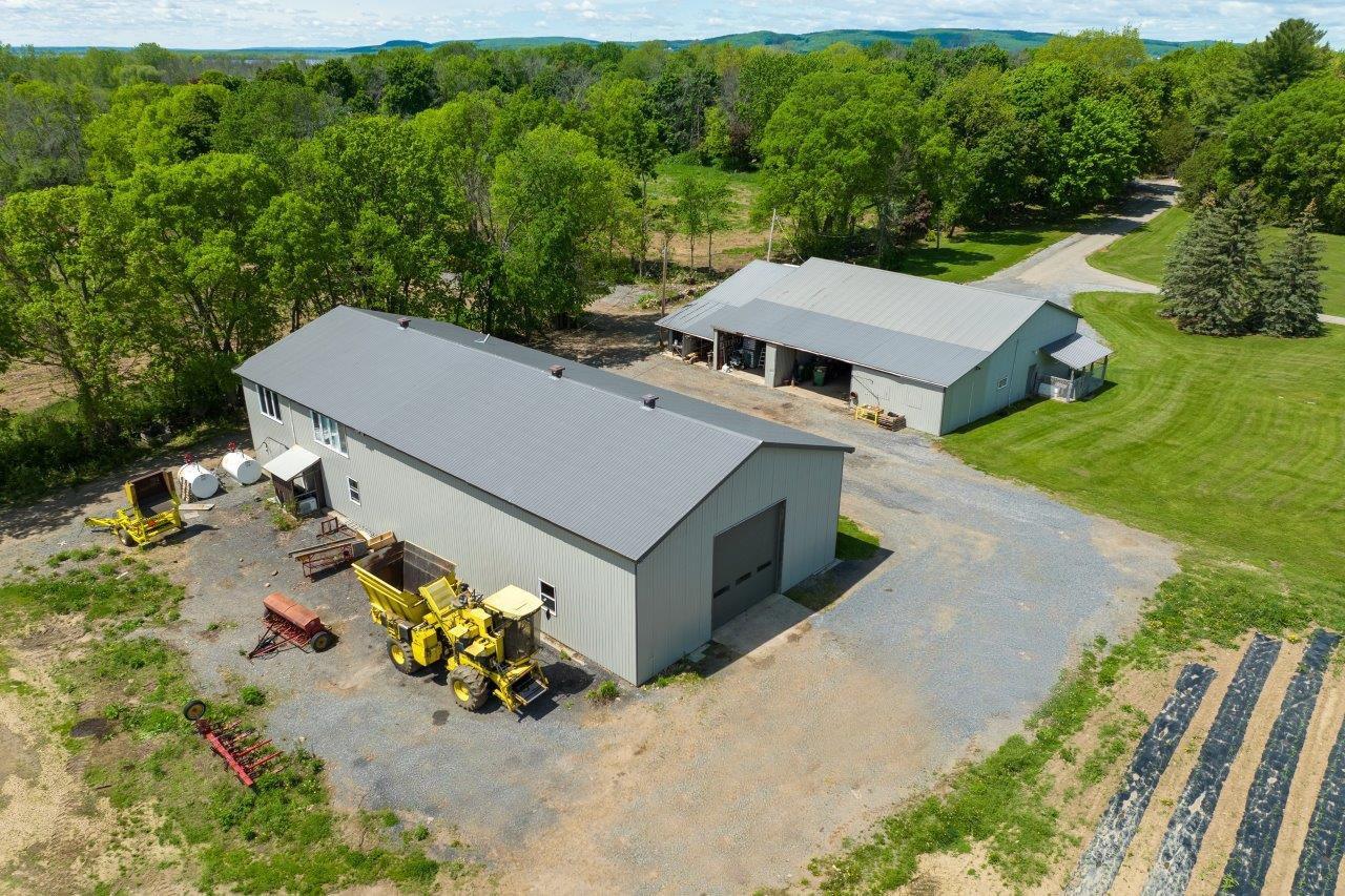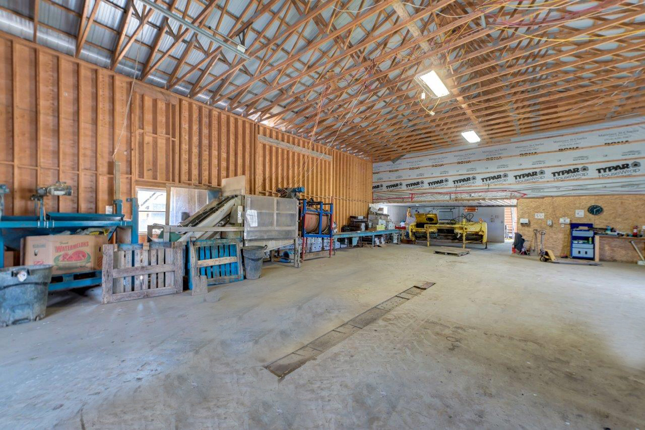 Le domaine agricole est également doté de bâtiments fonctionnels et bien adaptés à divers usages agricoles, incluant un garage à machinerie, un vaste entrepôt avec quai de chargement et espace réfrigéré, de même qu’un appartement destiné aux employés agricoles ou à un palefrenier.