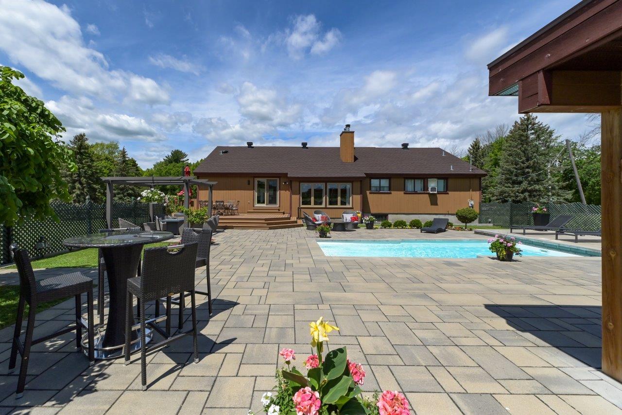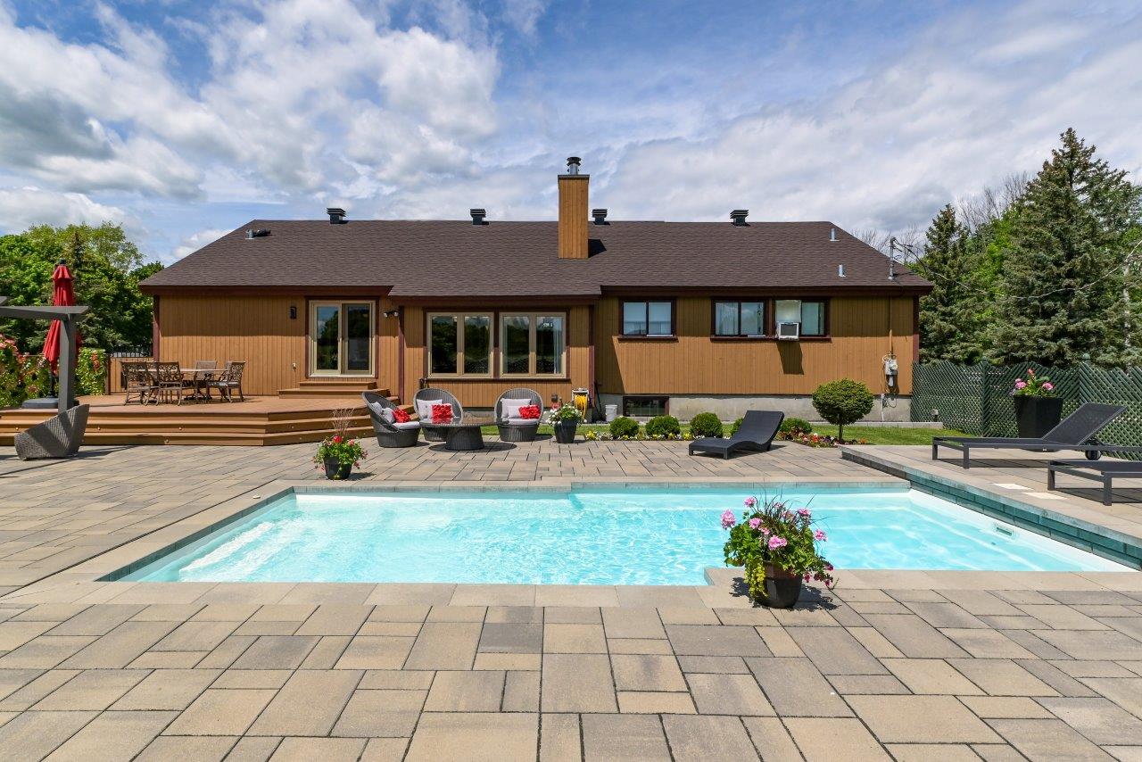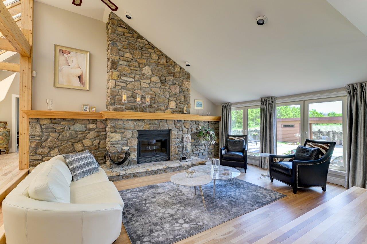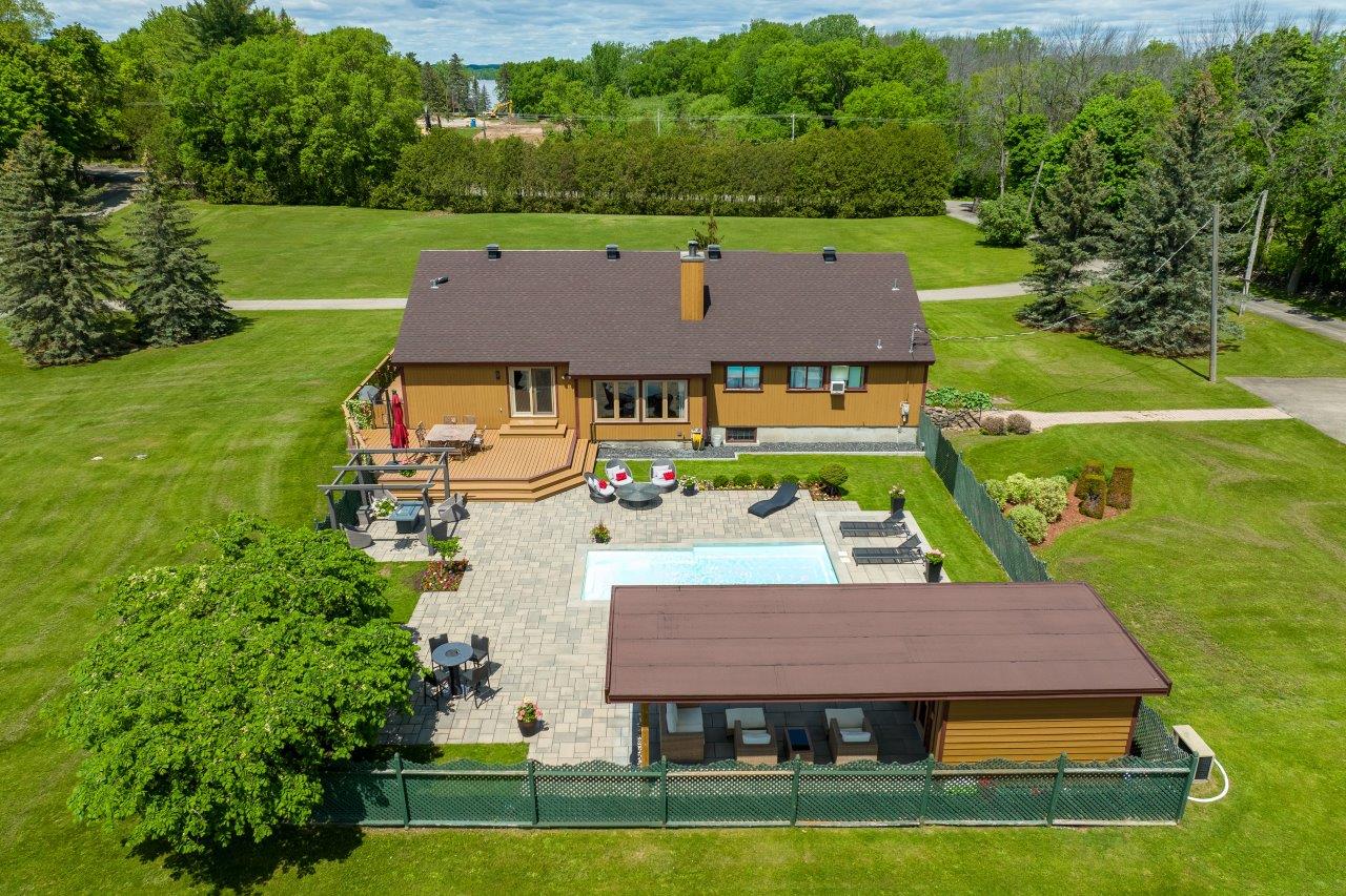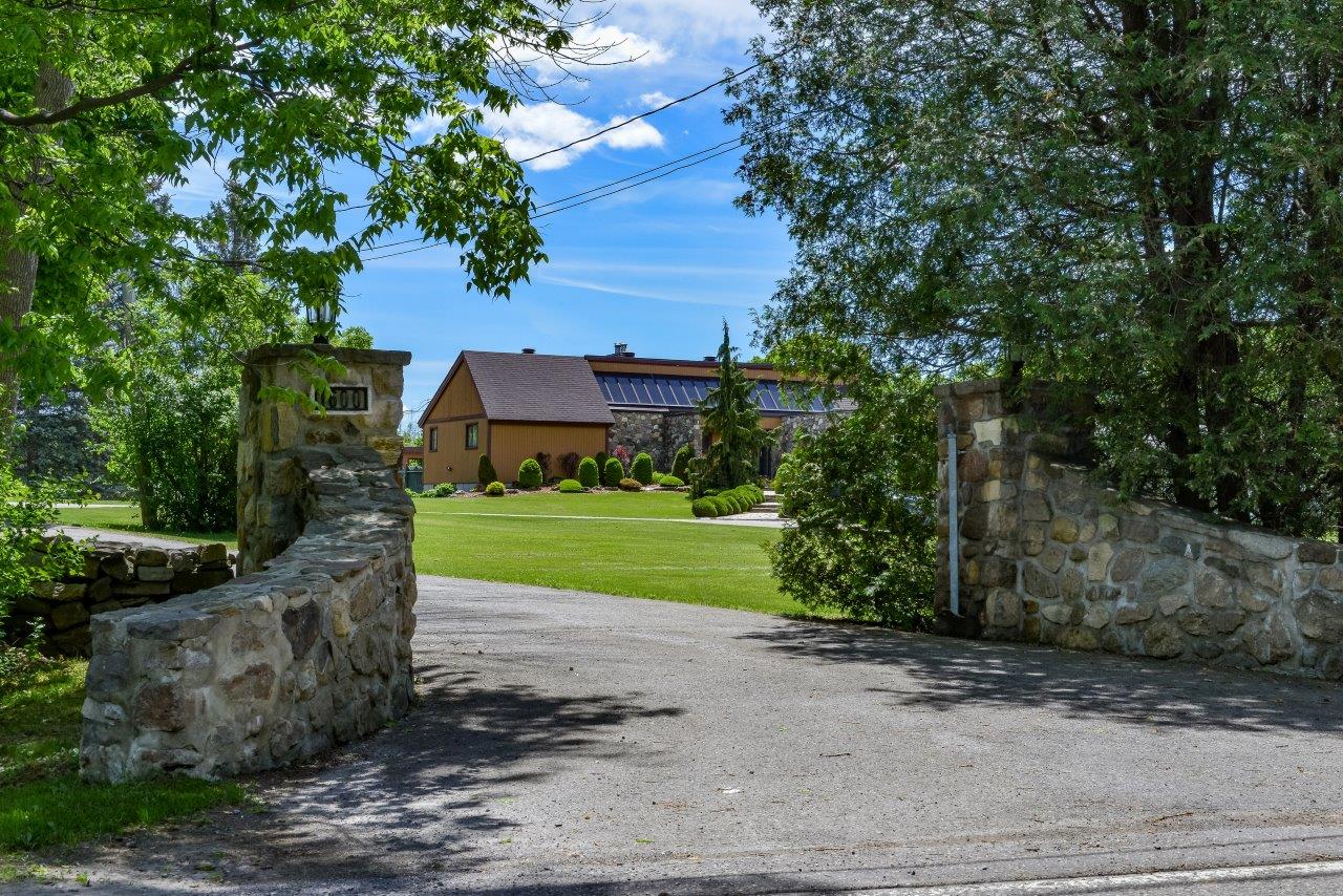 La propriété comprend une élégante résidence de 3 chambres à coucher, qui impressionne dès l’arrivée par sa longue cour circulaire et son spectaculaire aménagement paysager. À l’intérieur, la maison séduit par ses espaces ouverts, sa généreuse fenestration et son ambiance chaleureuse. Le salon est tout simplement remarquable avec ses hauts plafonds, ses puits de lumière et son majestueux foyer en pierres des champs. La cuisine moderne ravira les amateurs de gastronomie grâce à ses comptoirs de quartz, son îlot central et son coin repas intégré. À l’arrière, la cour propose un véritable espace de détente avec une vaste terrasse, plusieurs zones de repos, un sauna à vapeur ainsi qu’une piscine creusée, chauffée et au sel.