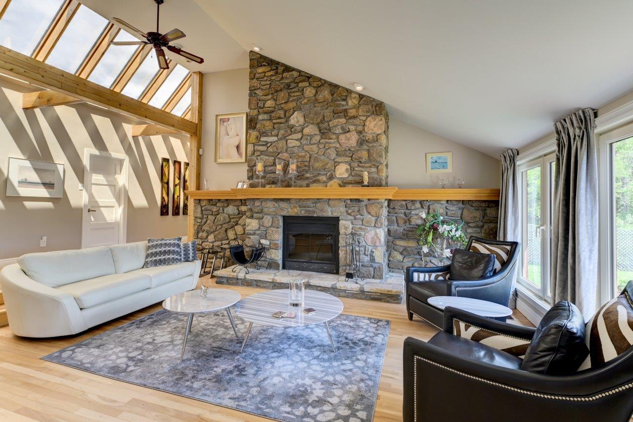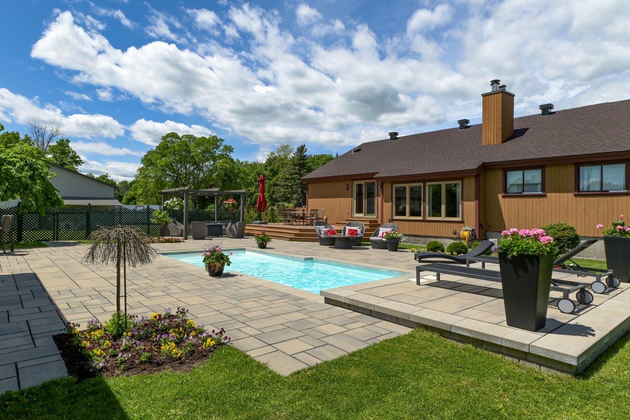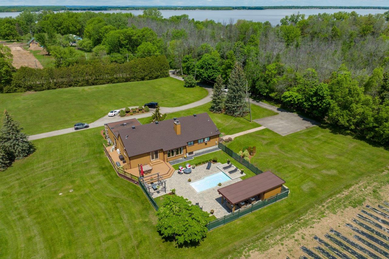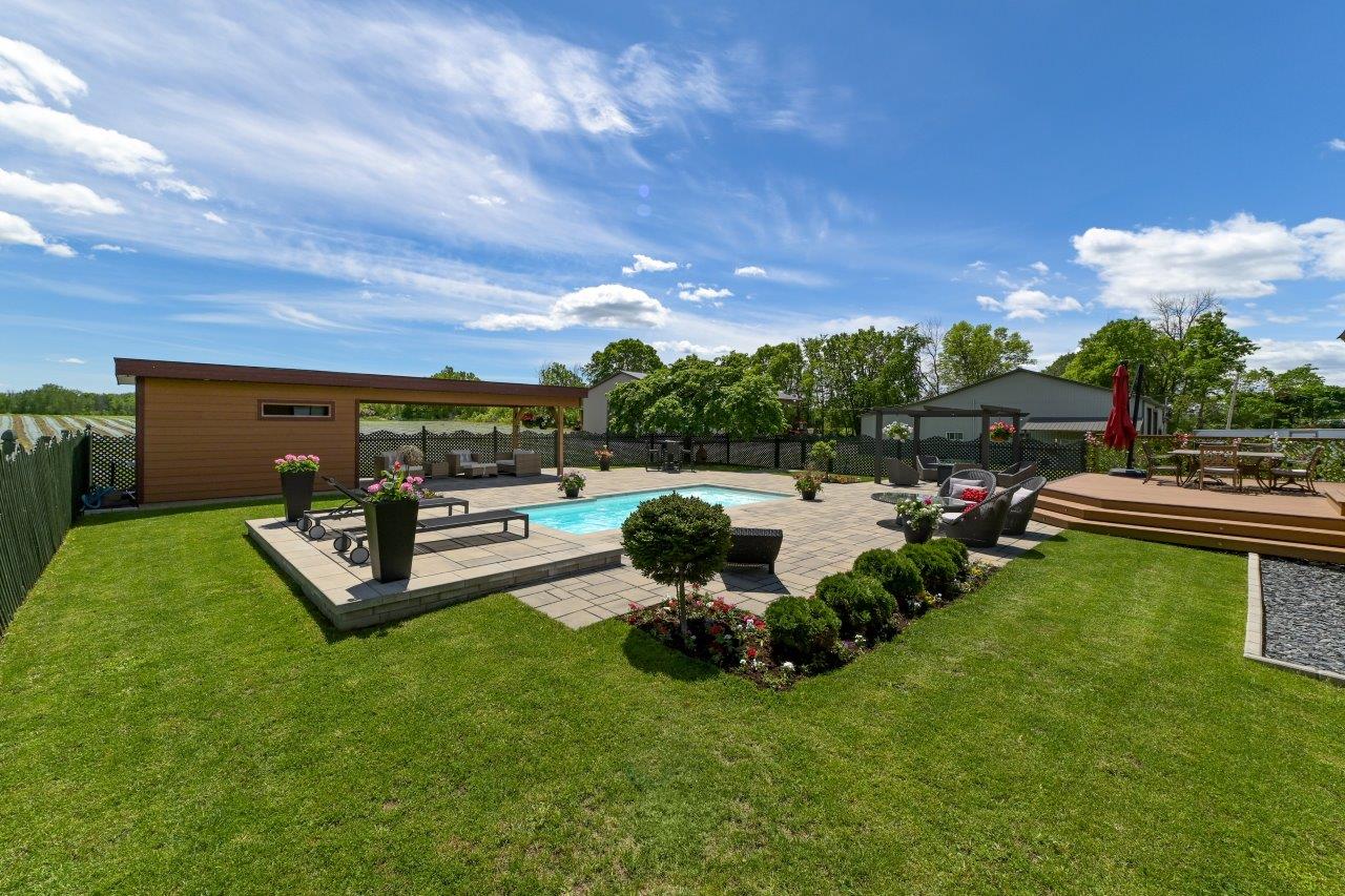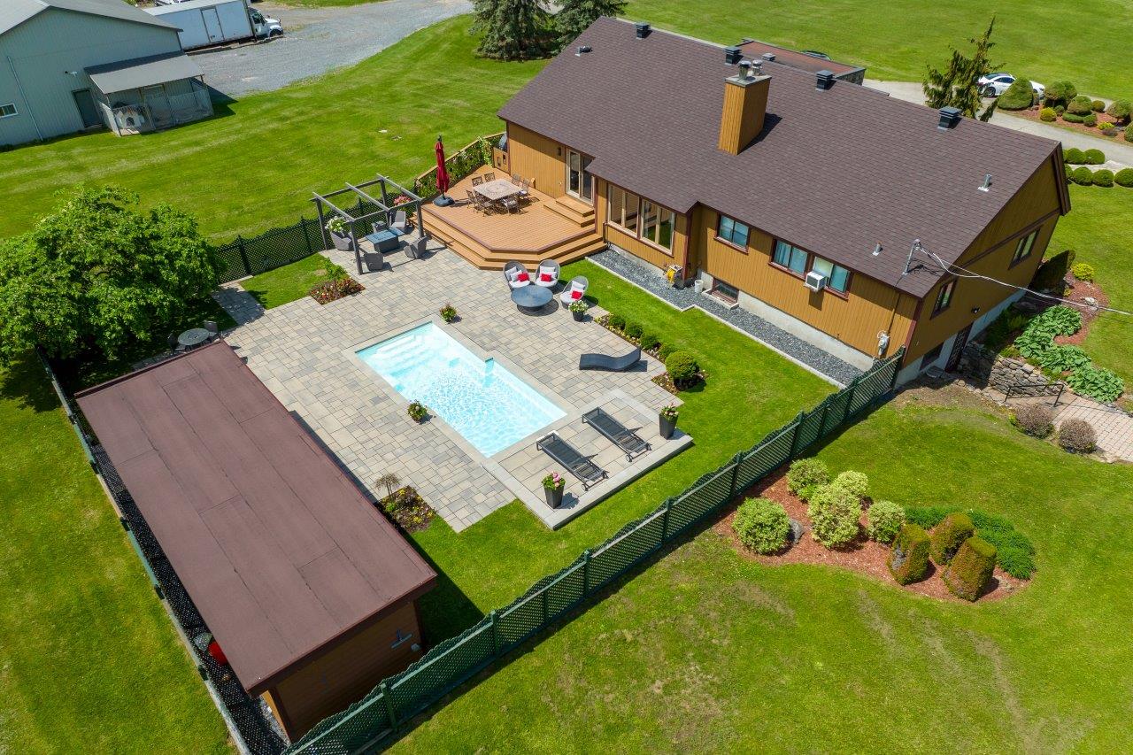La propriété comprend une élégante résidence de 3 chambres à coucher, qui impressionne dès l’arrivée par sa longue cour circulaire et son spectaculaire aménagement paysager. À l’intérieur, la maison séduit par ses espaces ouverts, sa généreuse fenestration et son ambiance chaleureuse. Le salon est tout simplement remarquable avec ses hauts plafonds, ses puits de lumière et son majestueux foyer en pierres des champs. La cuisine moderne ravira les amateurs de gastronomie grâce à ses comptoirs de quartz, son îlot central et son coin repas intégré. À l’arrière, la cour propose un véritable espace de détente avec une vaste terrasse, plusieurs zones de repos, un sauna à vapeur ainsi qu’une piscine creusée, chauffée et au sel.