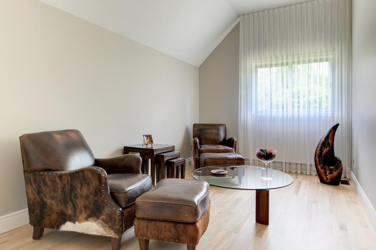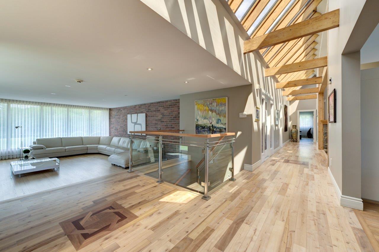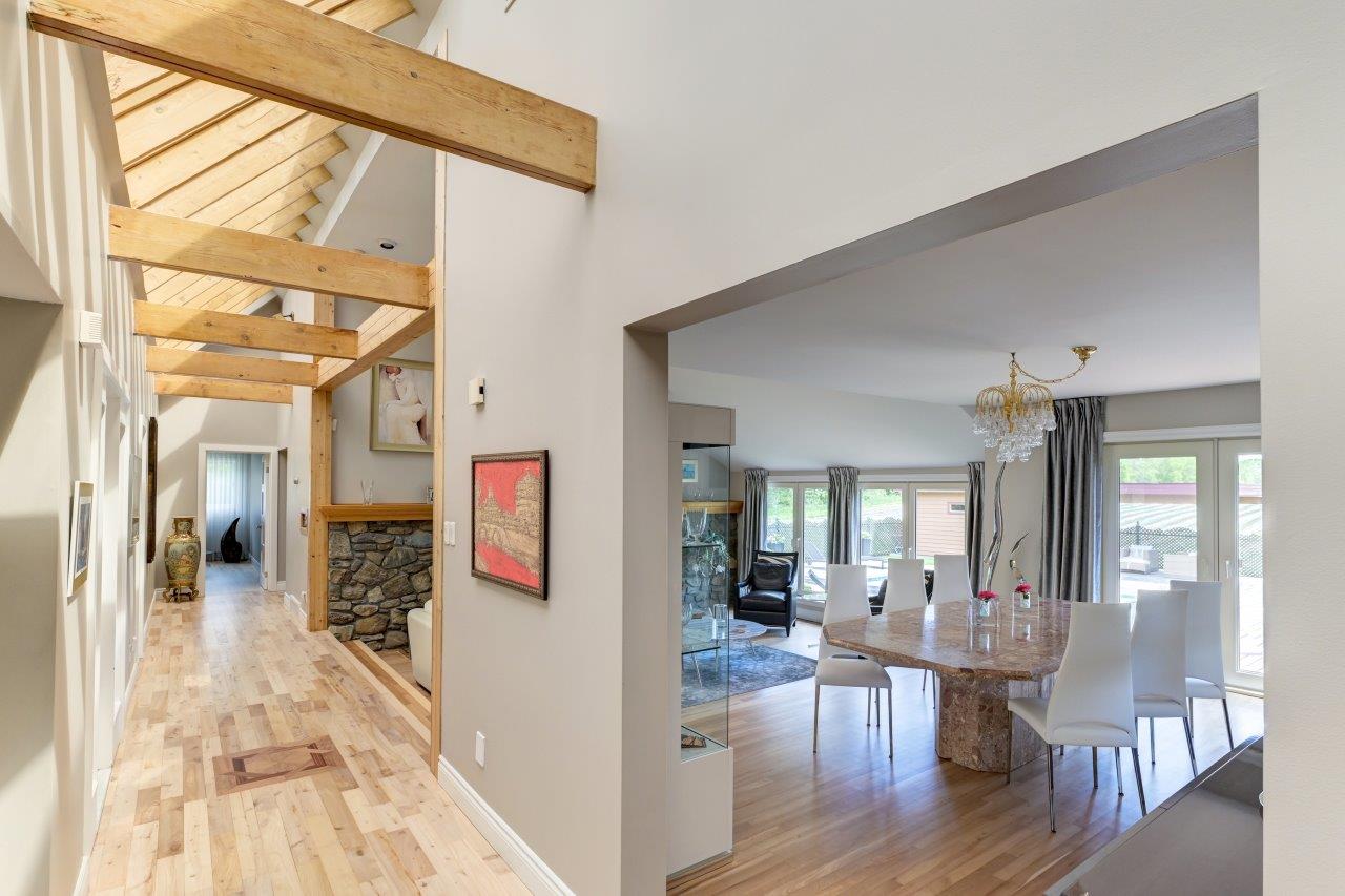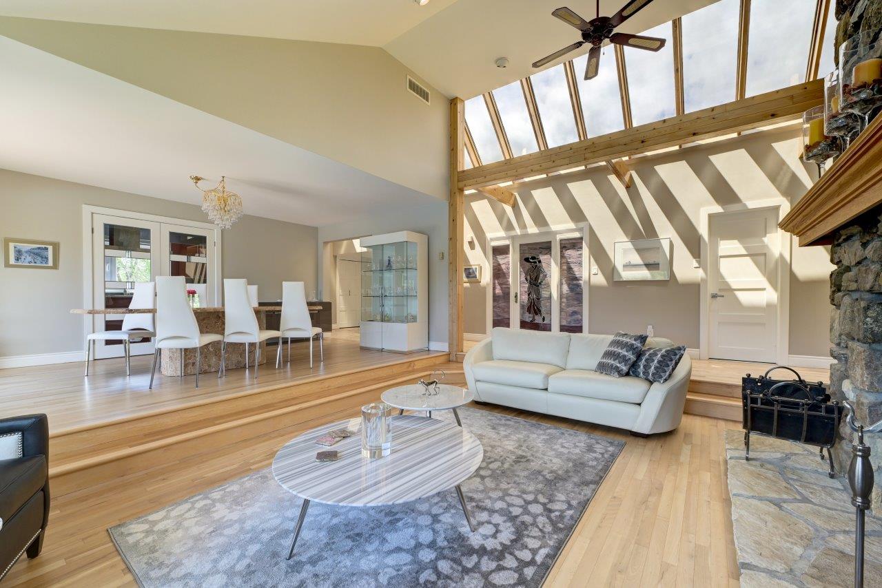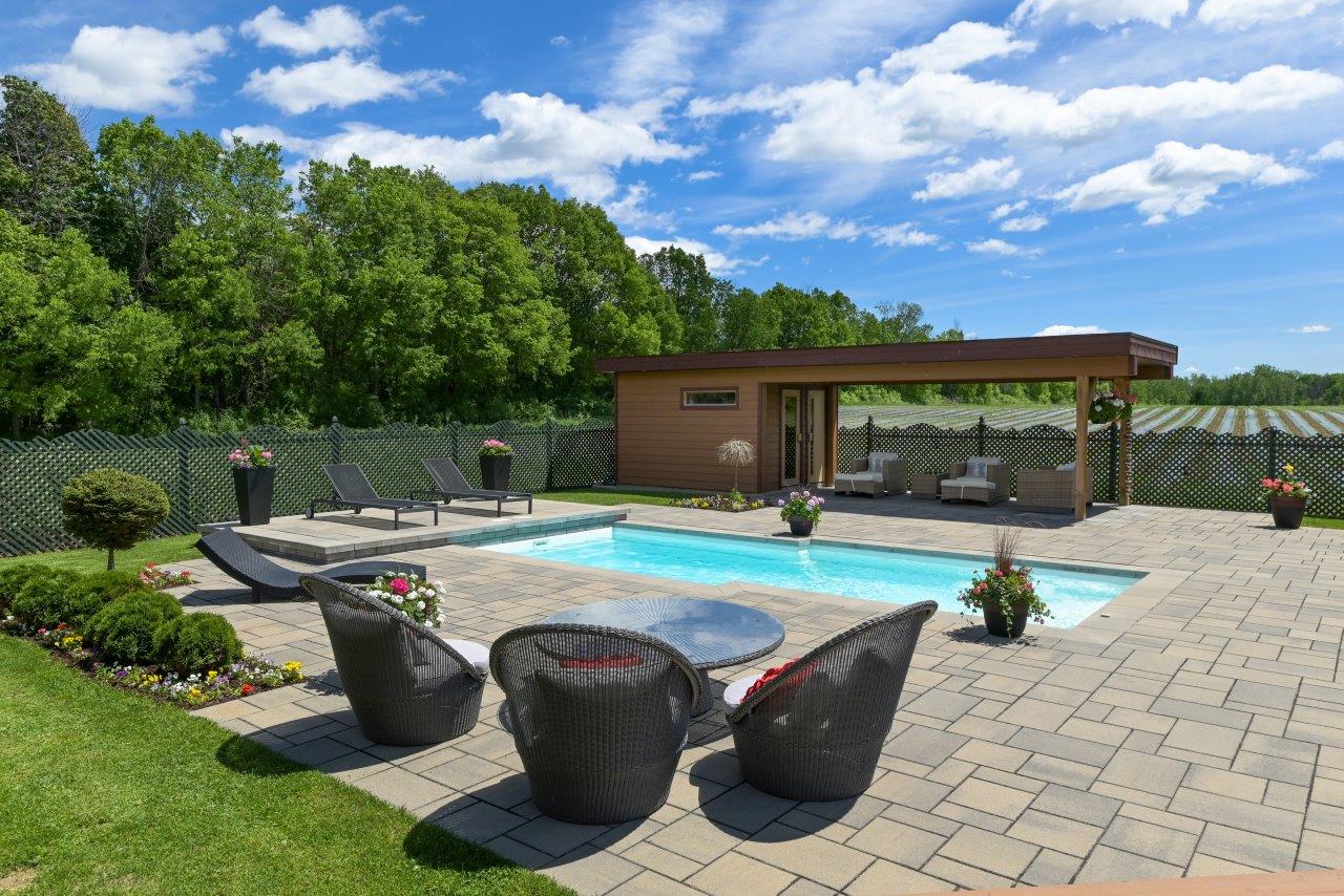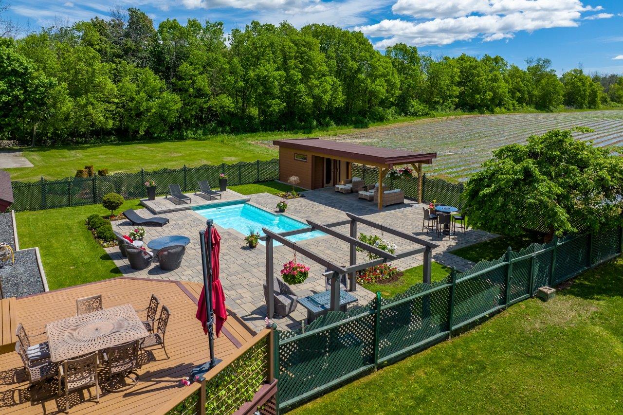 La propriété comprend une élégante résidence de 3 chambres à coucher, qui impressionne dès l’arrivée par sa longue cour circulaire et son spectaculaire aménagement paysager. À l’intérieur, la maison séduit par ses espaces ouverts, sa généreuse fenestration et son ambiance chaleureuse. Le salon est tout simplement remarquable avec ses hauts plafonds, ses puits de lumière et son majestueux foyer en pierres des champs. La cuisine moderne ravira les amateurs de gastronomie grâce à ses comptoirs de quartz, son îlot central et son coin repas intégré. À l’arrière, la cour propose un véritable espace de détente avec une vaste terrasse, plusieurs zones de repos, un sauna à vapeur ainsi qu’une piscine creusée, chauffée et au sel.