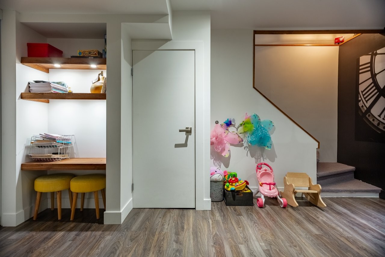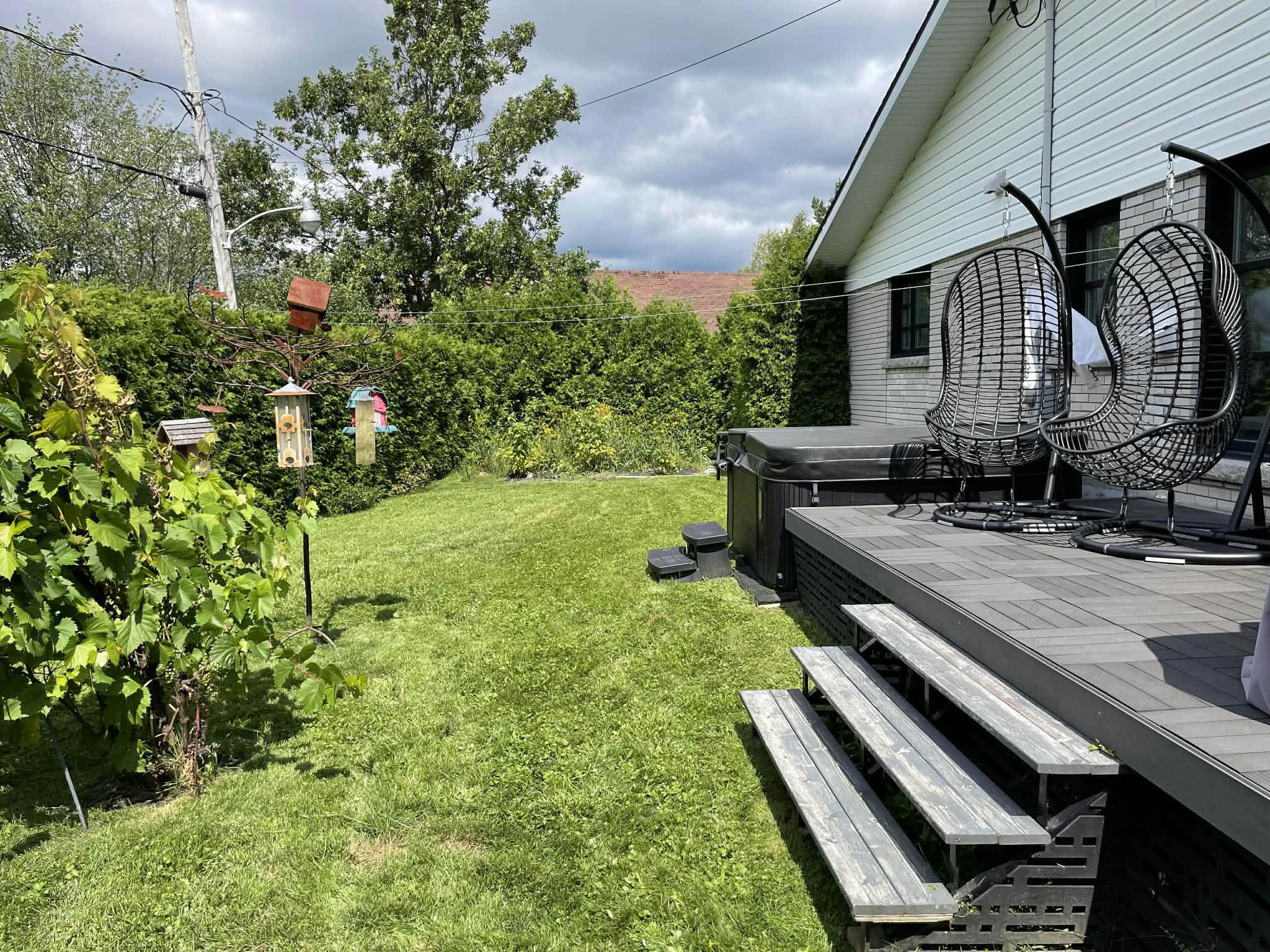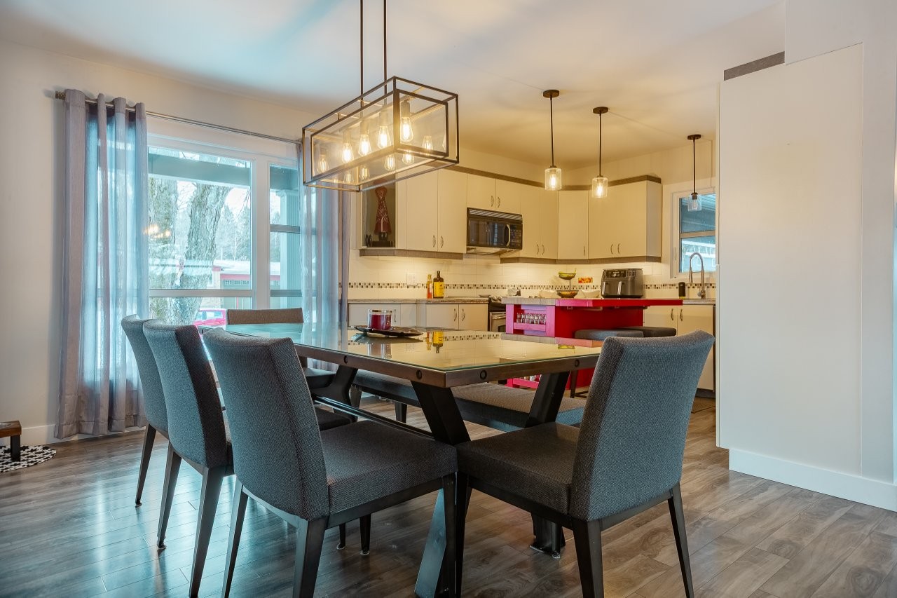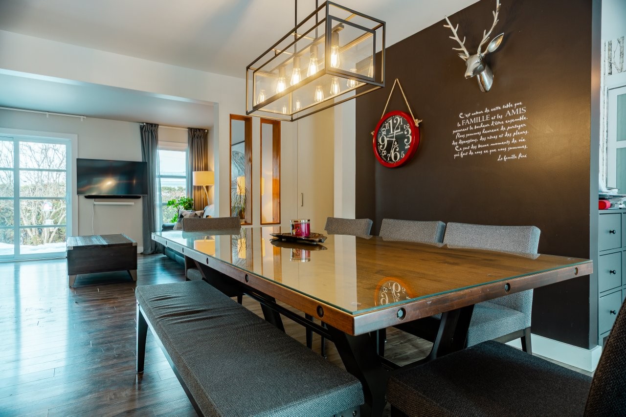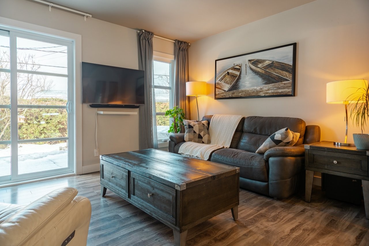 L’aire de vie au rez-de-chaussée est lumineuse et accueillante, avec un accès direct au patio arrière en béton qui est recouvert d’un revêtement de PVC sans entretien. Cet espace est parfaitement aménagé pour profiter pleinement de la belle saison, que ce soit pour se détendre ou recevoir, avec en prime un spa inclus dans la vente.