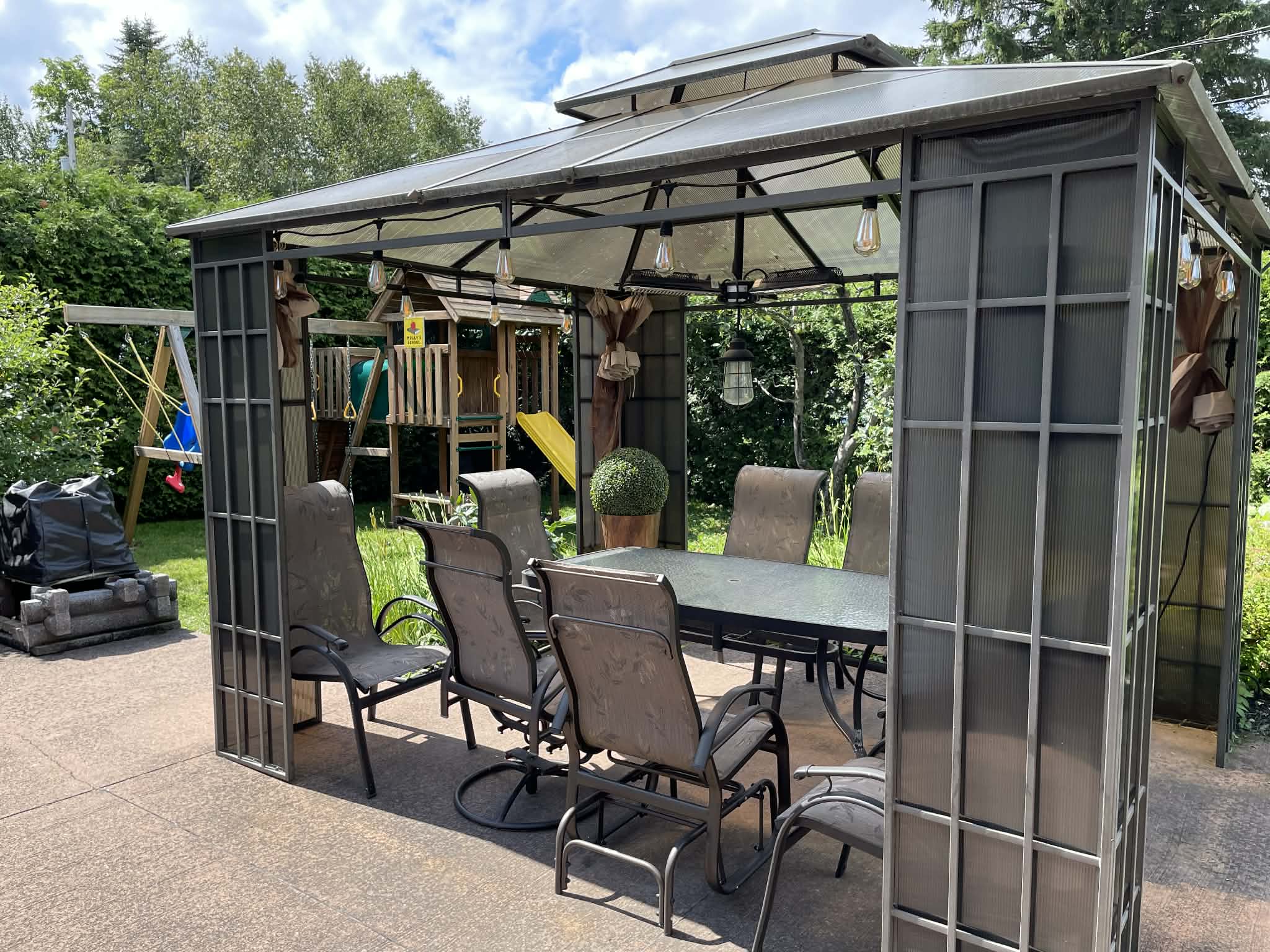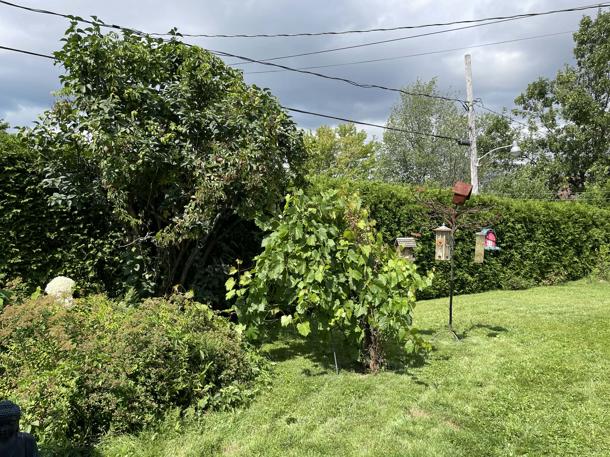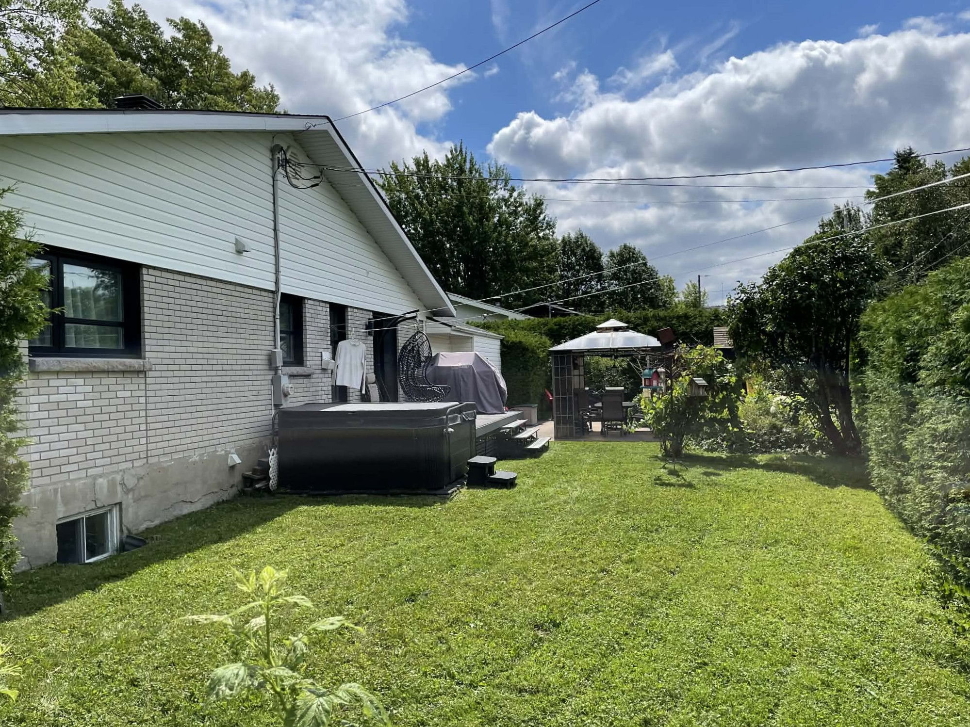 La cour arrière se distingue par son aménagement soigné et son intimité. On y retrouve de jolis petits arbustes et pommiers, un espace détente avec gazebo ainsi qu’un petit bassin d’eau, le tout bordé de haies de cèdres matures. Un cabanon offre du rangement additionnel avec un espace facilement accessible, autant par l’avant que par l’arrière de la propriété. Un carport fermé sur trois côtés, avec espace de rangement intégré, ajoute un espace pour le rangement et le stationnement à l’abri.