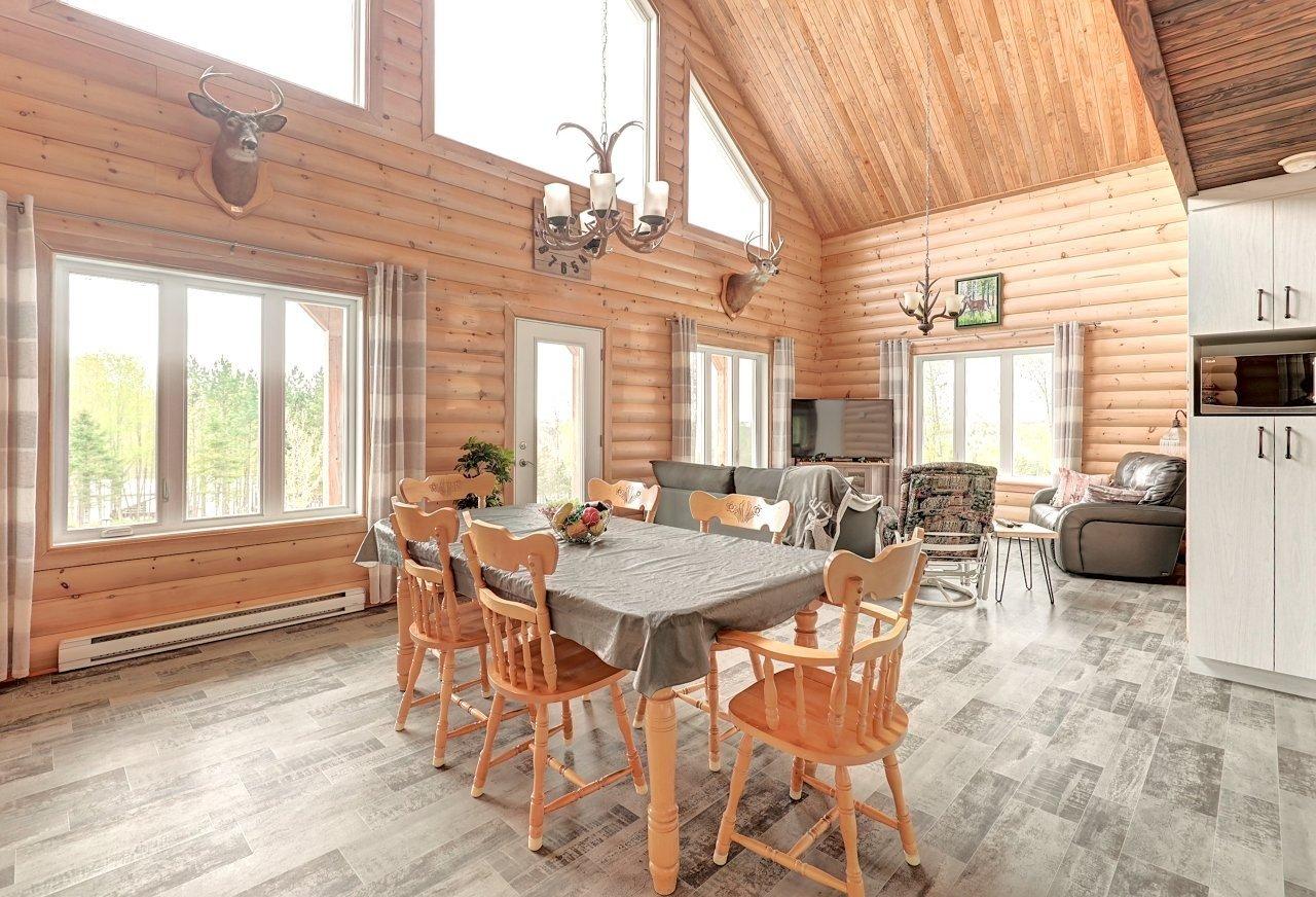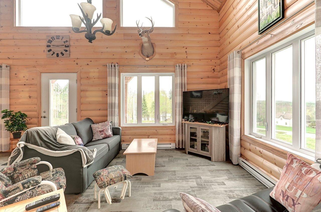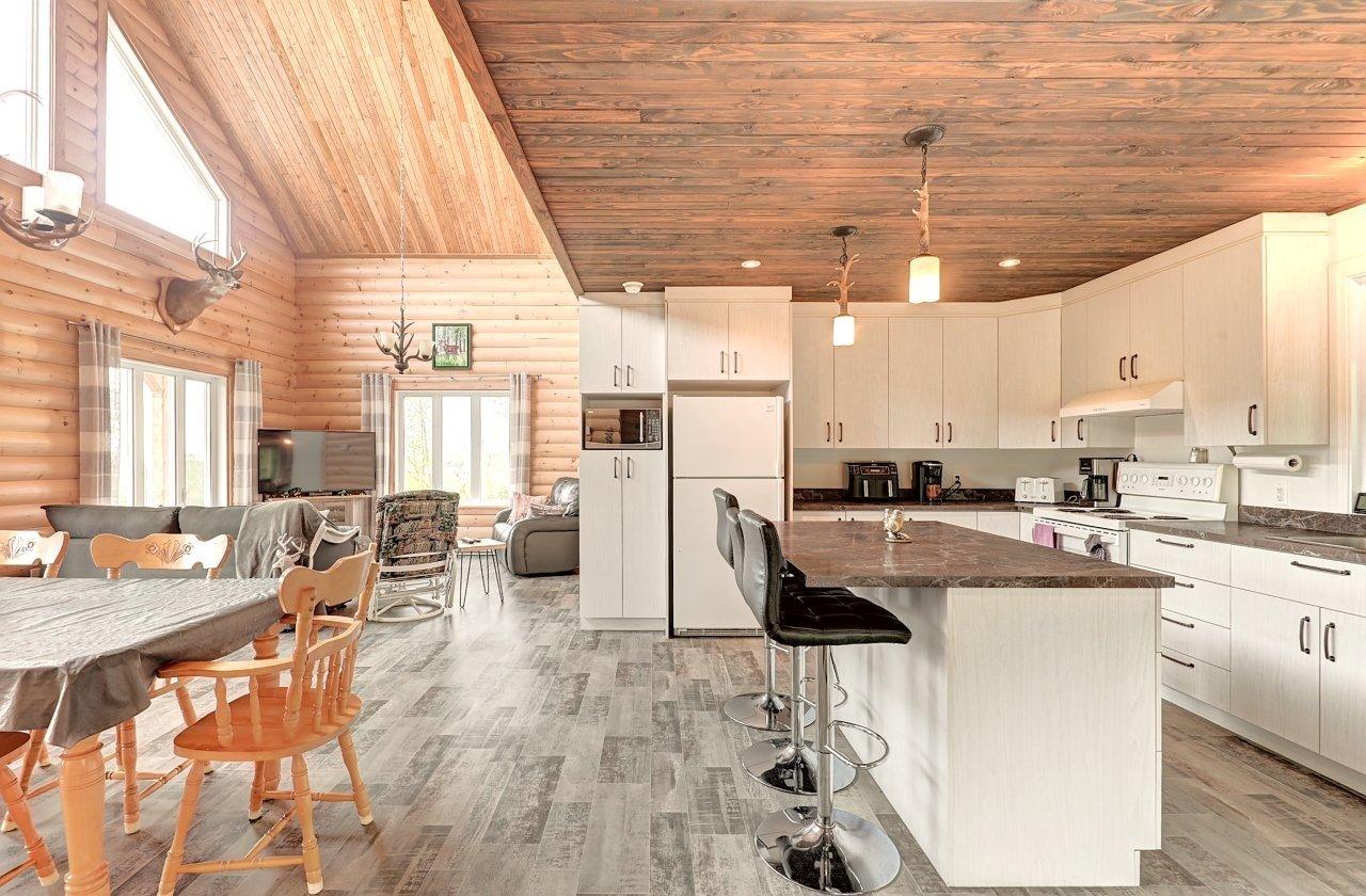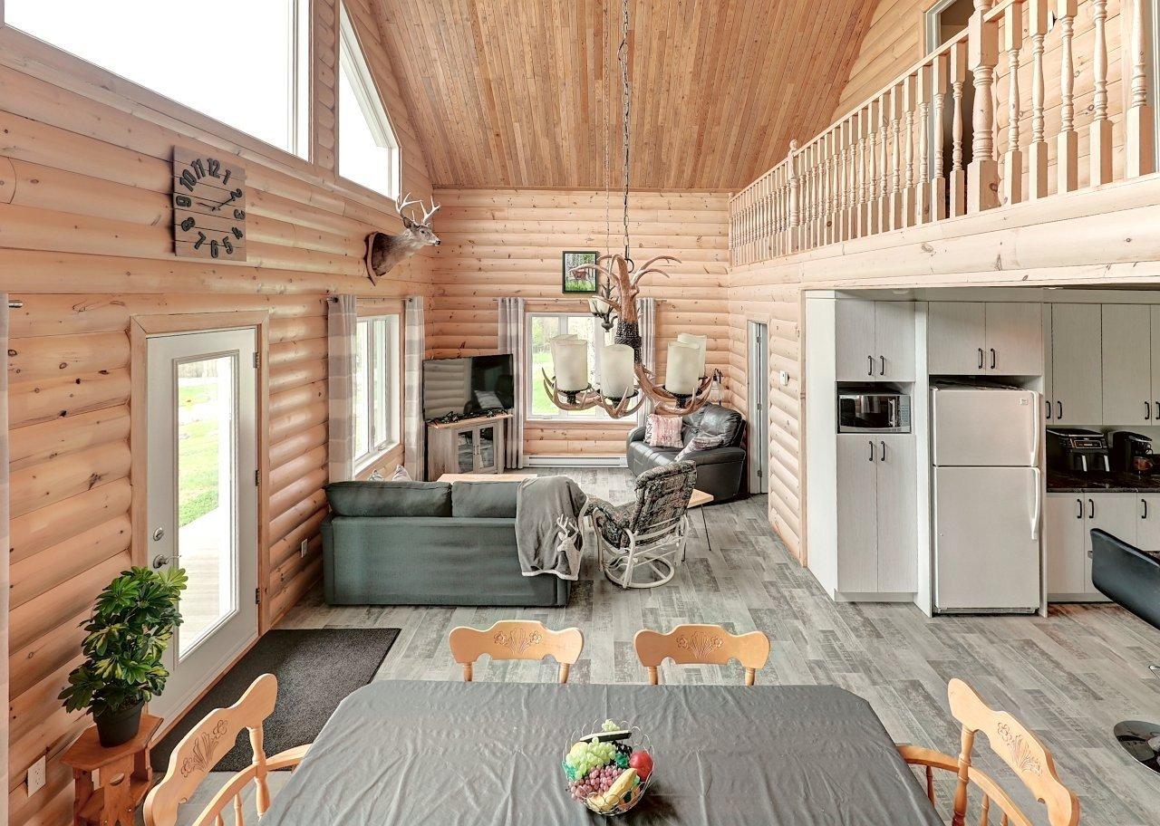 Dominant le paysage, la cabane à sucre offre un espace de vie convivial et lumineux. Elle comprend deux chambres, une salle de bain complète, et une vaste aire ouverte regroupant le salon, la cuisine et la salle à manger. L’intérieur en bois naturel et les grandes fenêtres créent une ambiance chaleureuse avec une vue imprenable sur les environs.