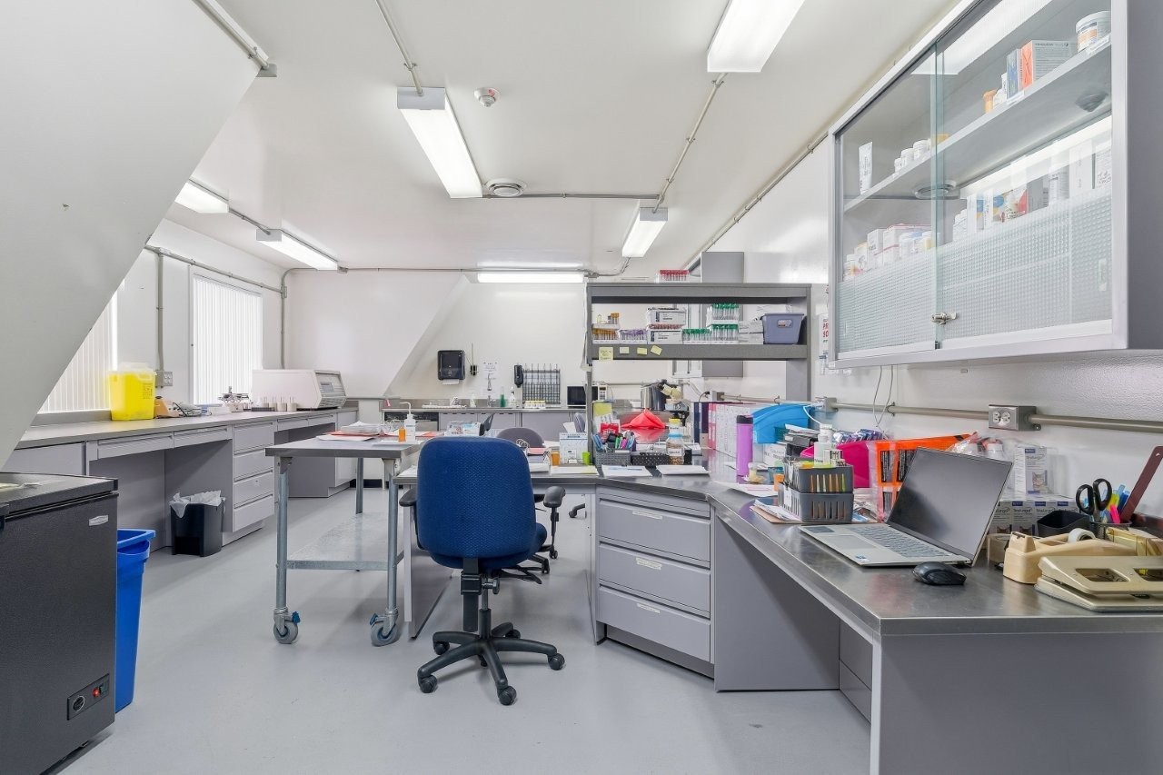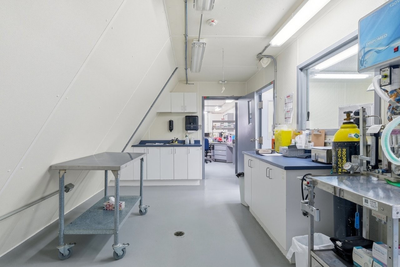 La seconde section est louée à Arthrolab inc., un centre de recherche de réputation spécialisé dans les études liées à l’arthrose chez les chiens et les chats. Les lieux comprennent un vestiaire, une salle de douche, un laboratoire, des salles pré et post-opératoires ainsi que des enclos adaptés aux chiens et aux chats.