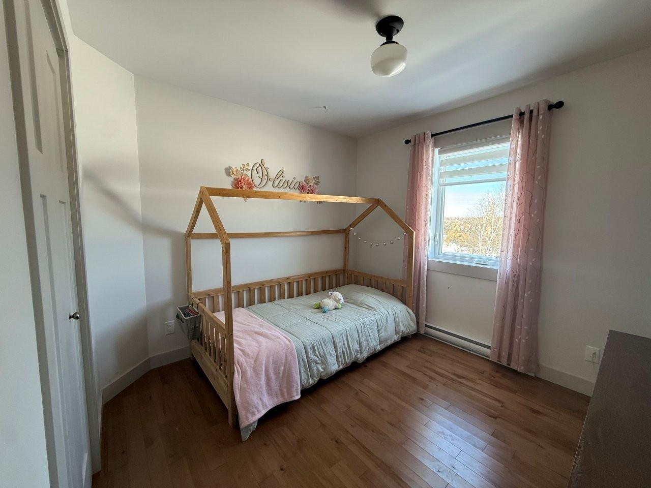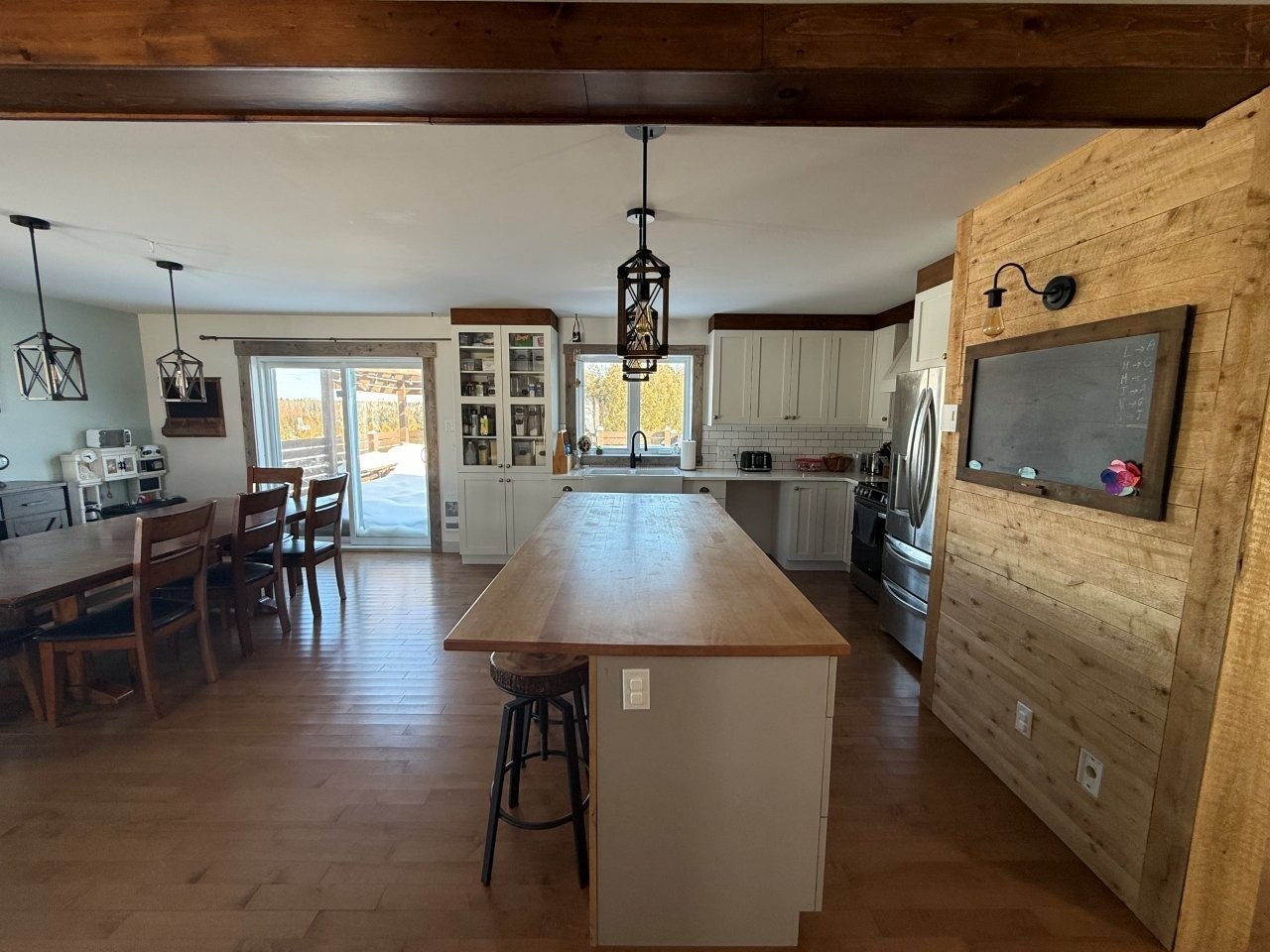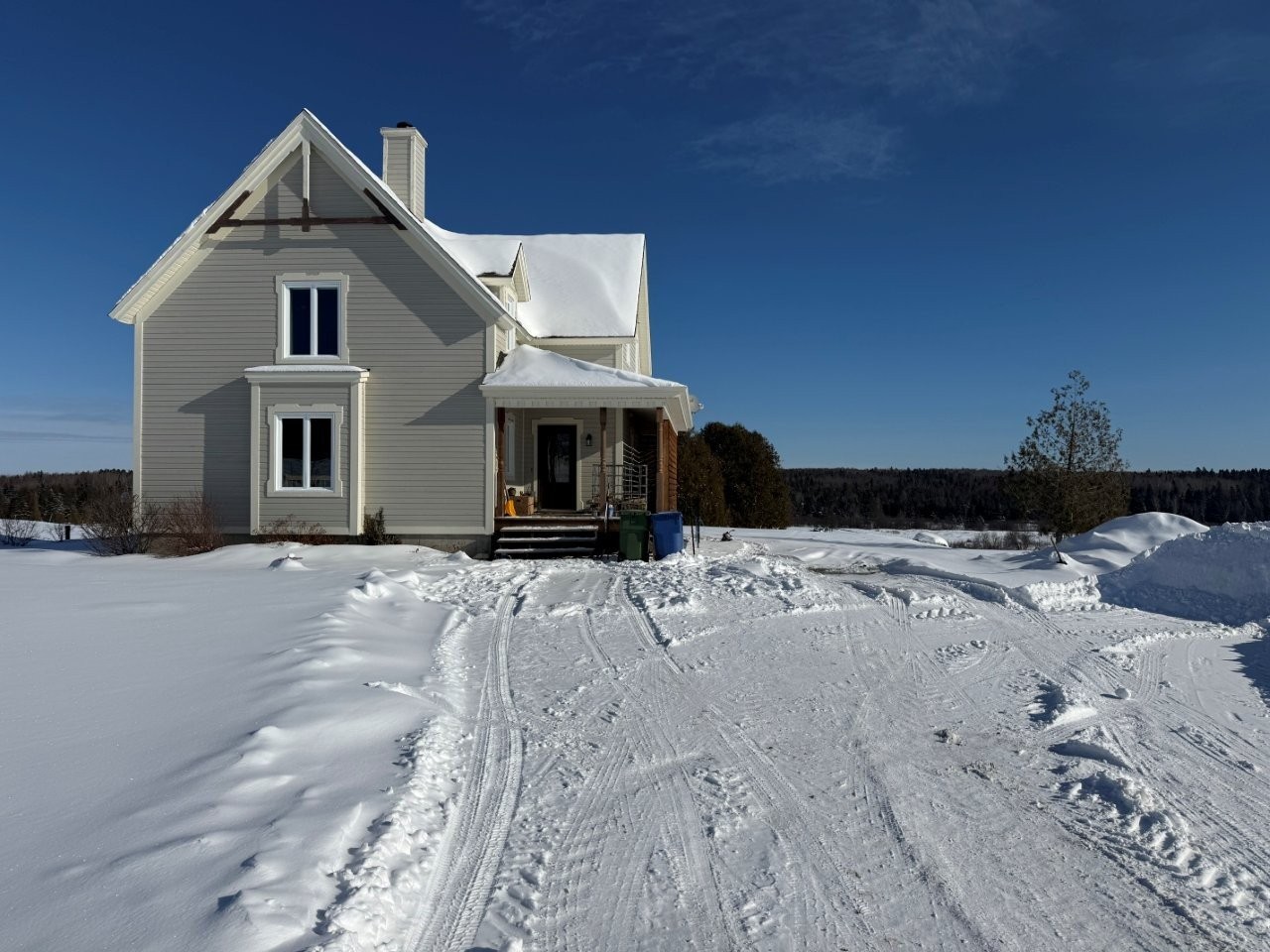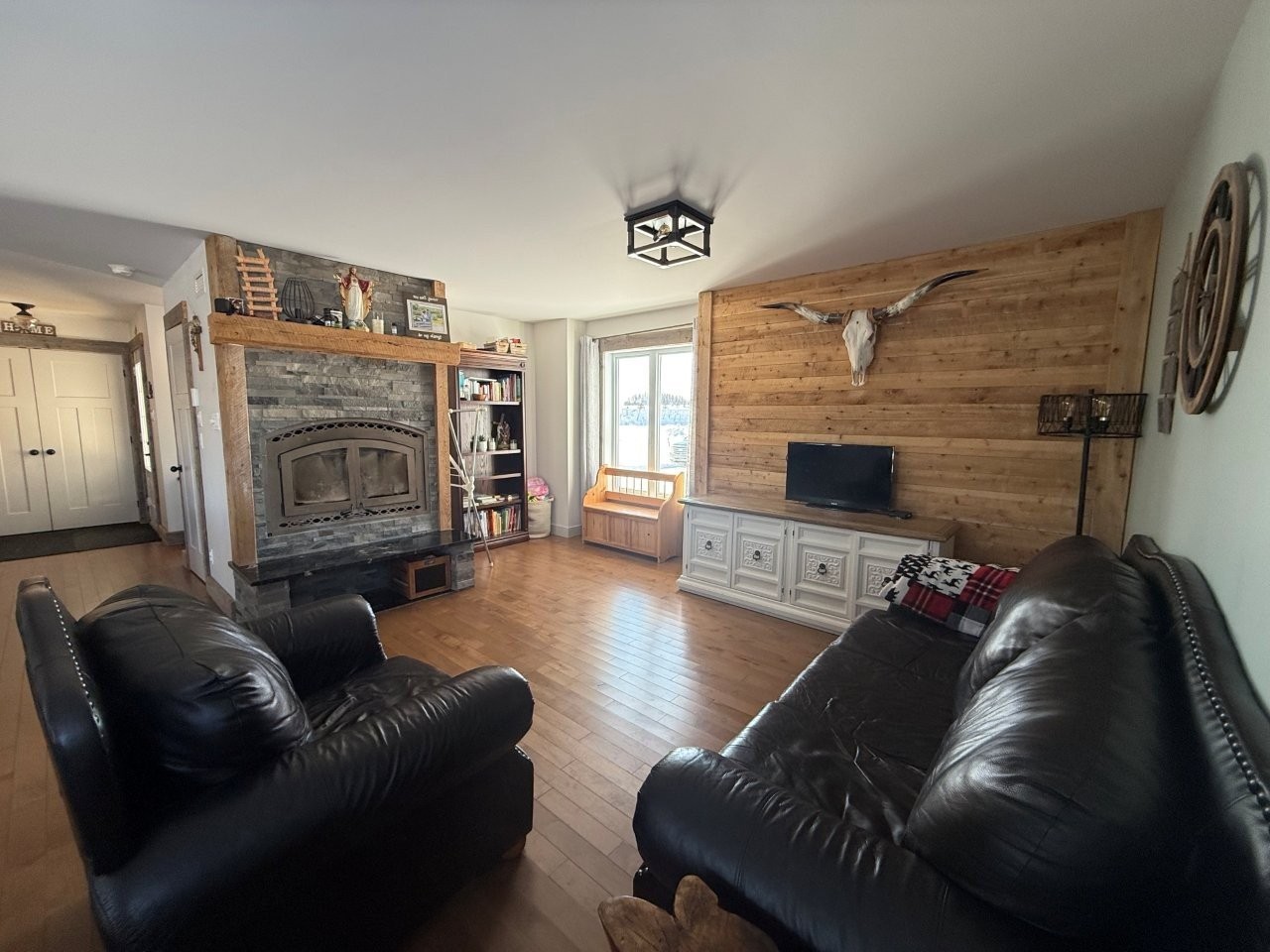 La maison, construite en 2017, propose une aire de vie conviviale et lumineuse. La cuisine se démarque par ses comptoirs de quartz, son îlot en bois et son aménagement pratique. Le salon, doté d’un foyer au bois, crée une atmosphère chaleureuse. Le sous-sol partiellement aménagé, avec entrée extérieure, comprend un bureau déjà équipé pour être facilement converti en deuxième salle de bain. Une thermopompe murale assure le confort en toute saison, tandis que la salle de bain principale est munie d’une douche indépendante et d’un joli bain sur pattes.