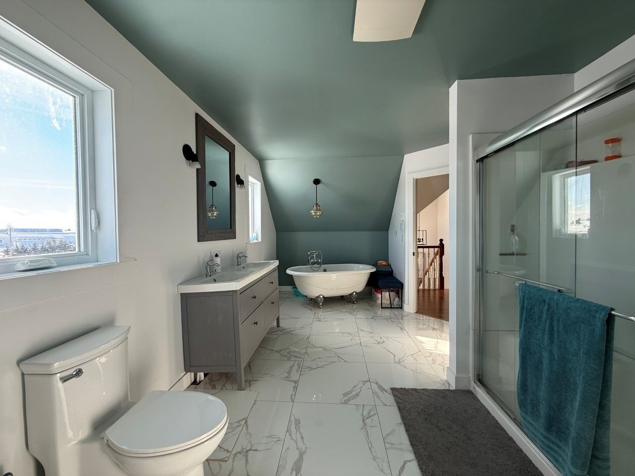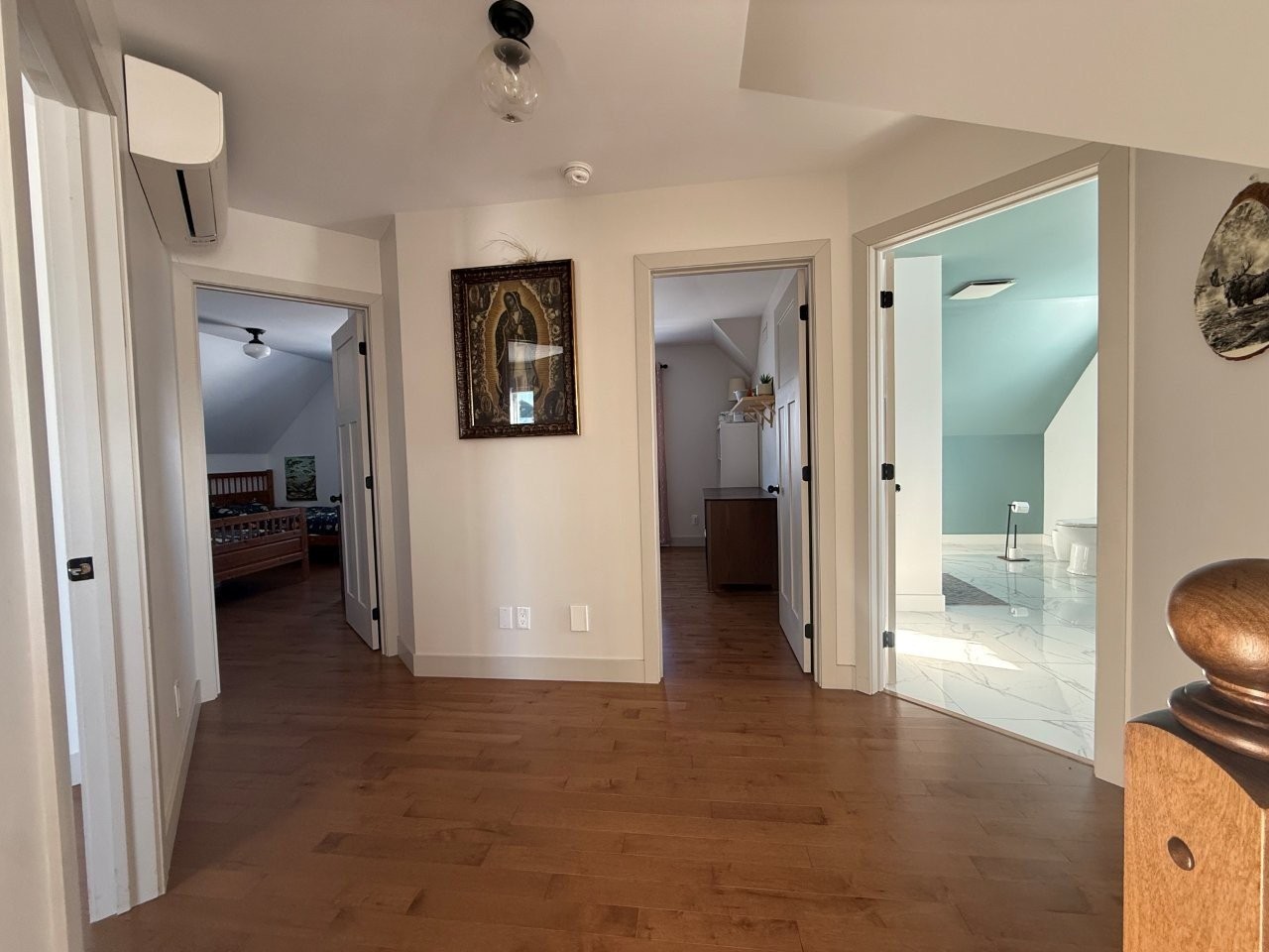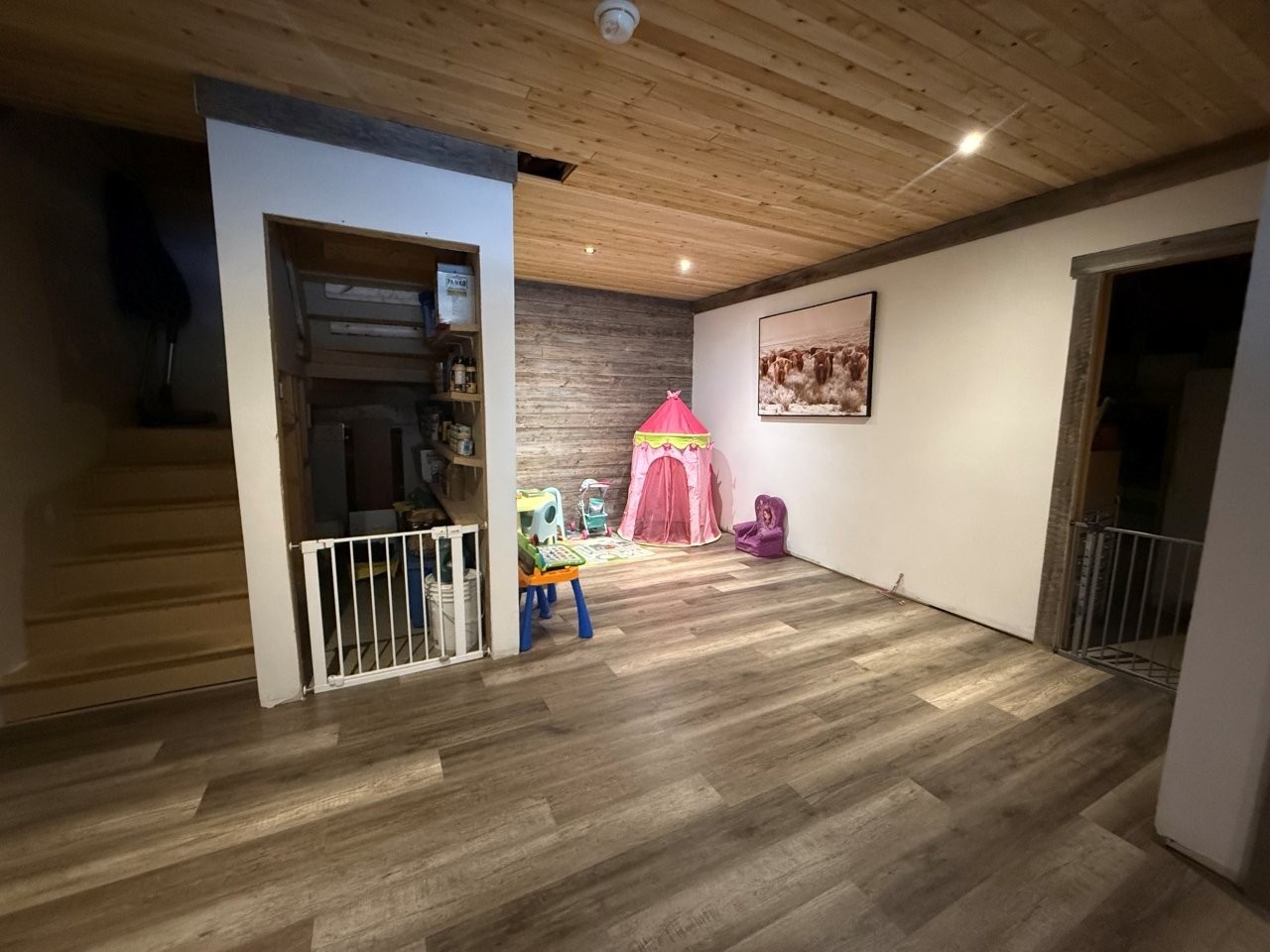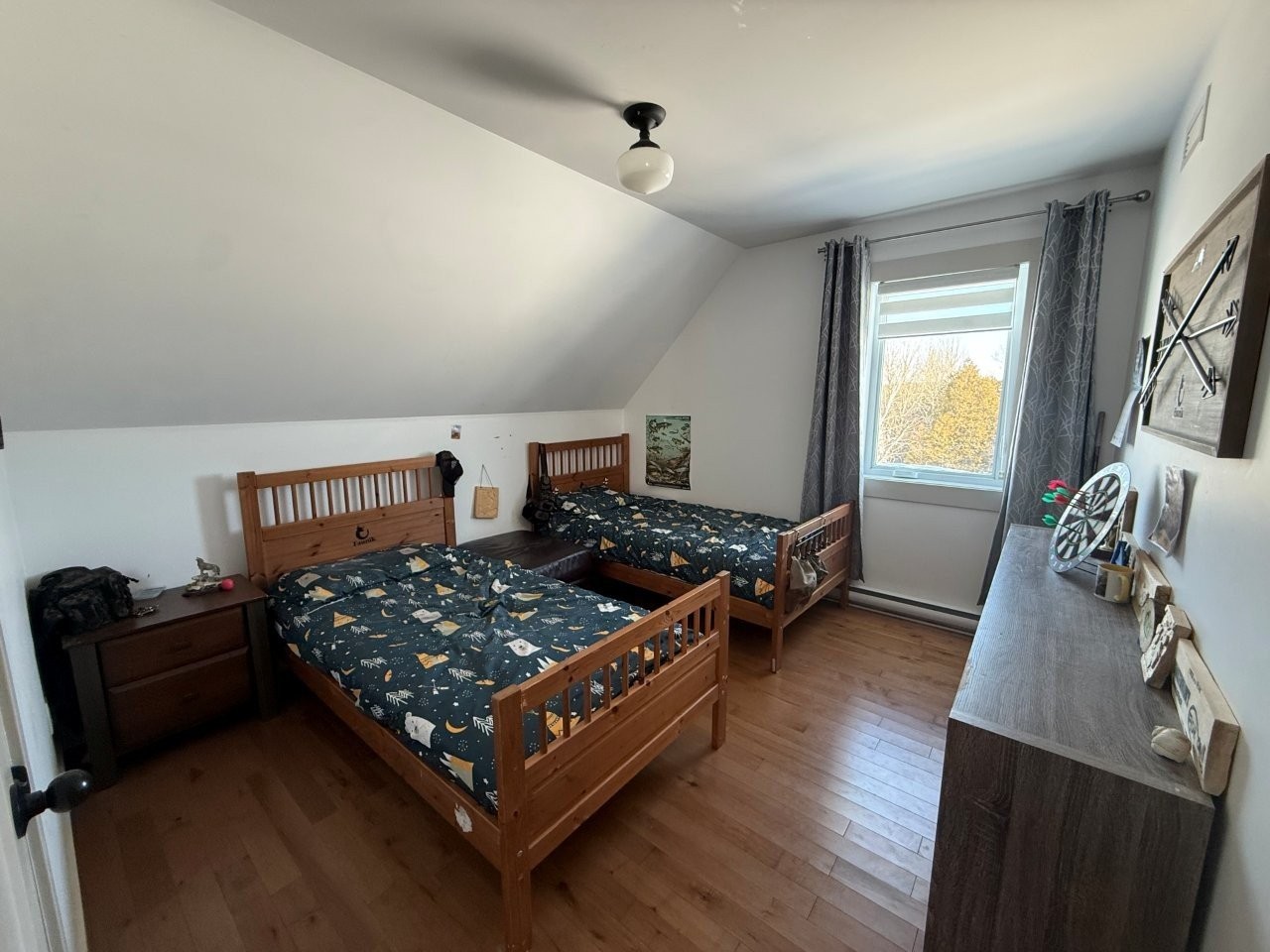 La maison, construite en 2017, propose une aire de vie conviviale et lumineuse. La cuisine se démarque par ses comptoirs de quartz, son îlot en bois et son aménagement pratique. Le salon, doté d’un foyer au bois, crée une atmosphère chaleureuse. Le sous-sol partiellement aménagé, avec entrée extérieure, comprend un bureau déjà équipé pour être facilement converti en deuxième salle de bain. Une thermopompe murale assure le confort en toute saison, tandis que la salle de bain principale est munie d’une douche indépendante et d’un joli bain sur pattes.
