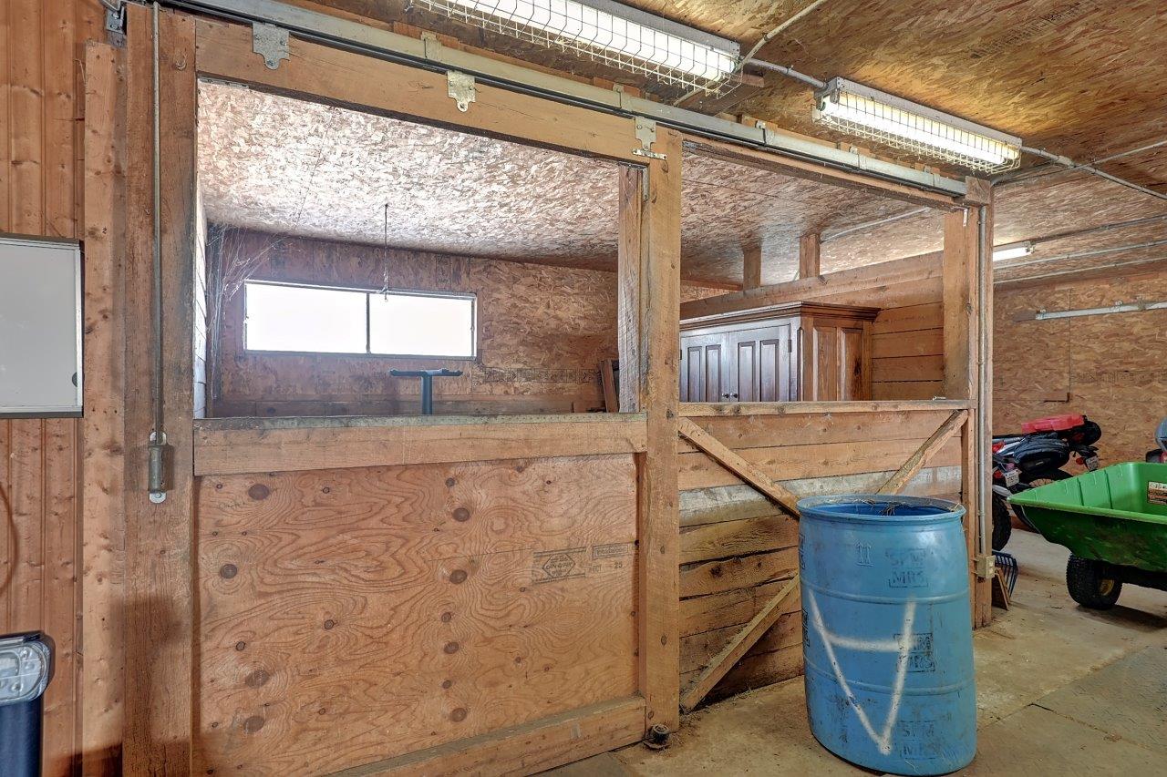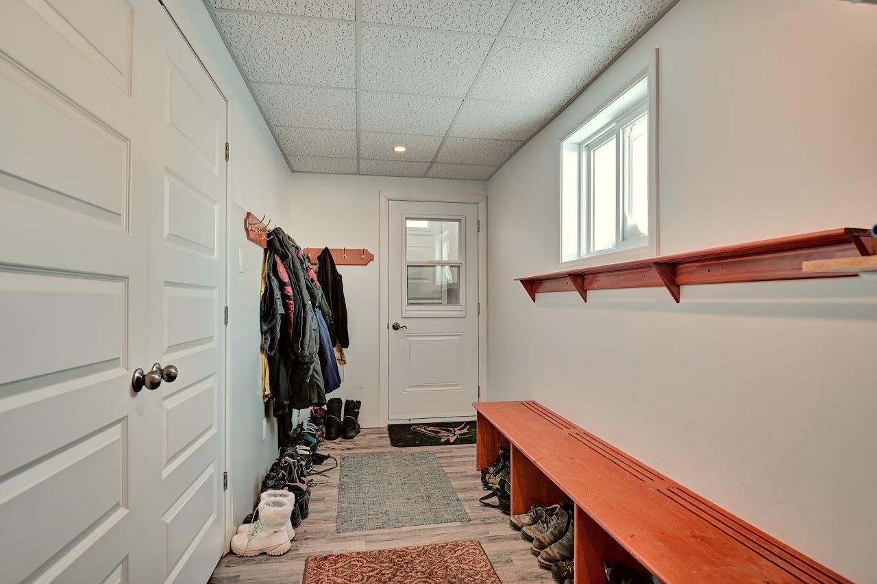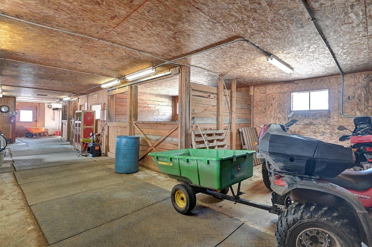 Au sous-sol, on y retrouve une salle familiale avec poêle à combustion lente, deux chambres (l’une d’elle ouverte), une salle de bain complète avec une deuxième salle de lavage pour les vêtements d’écurie, ainsi qu’un vestibule (mudroom), en bonne et due forme.