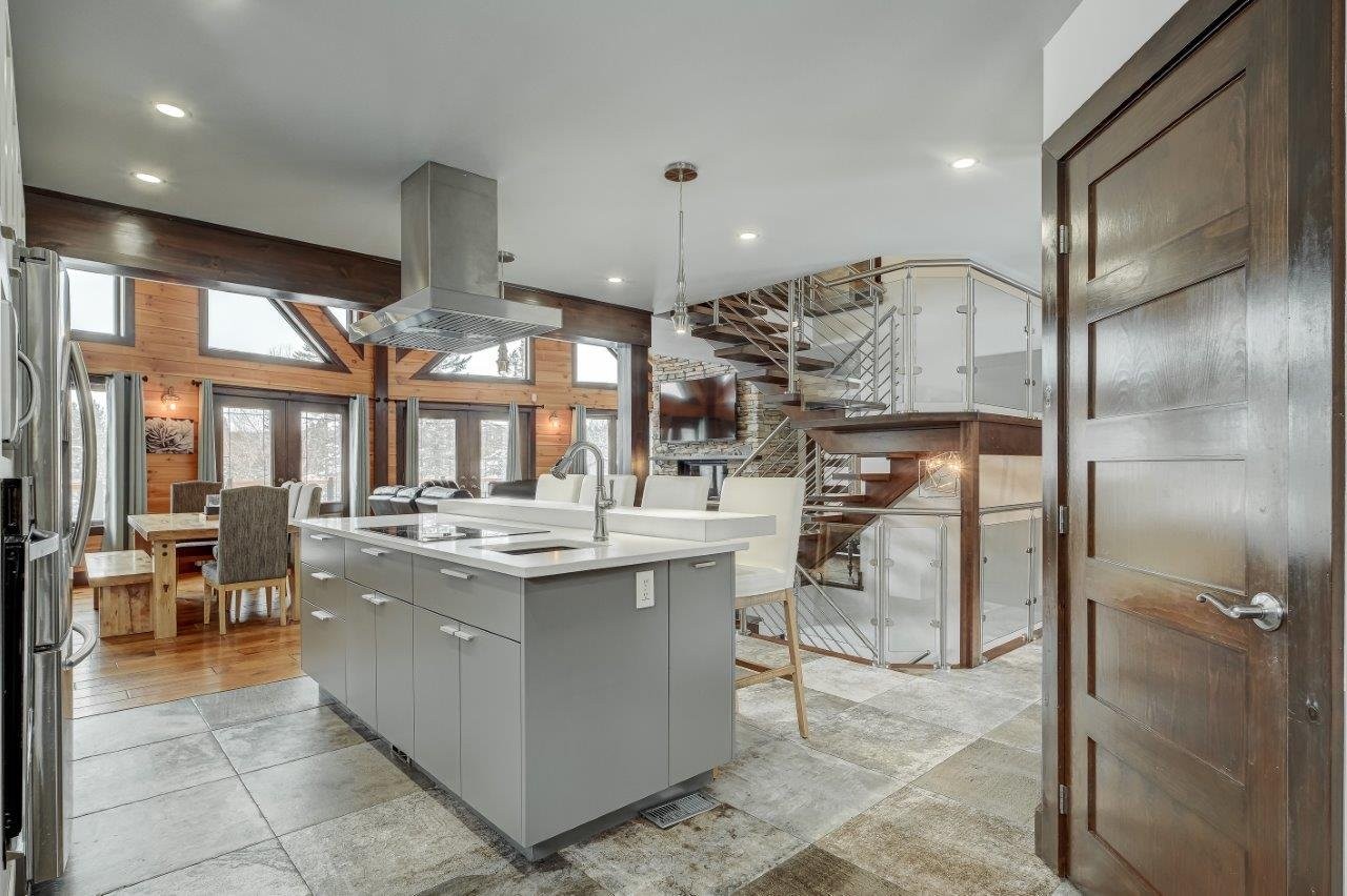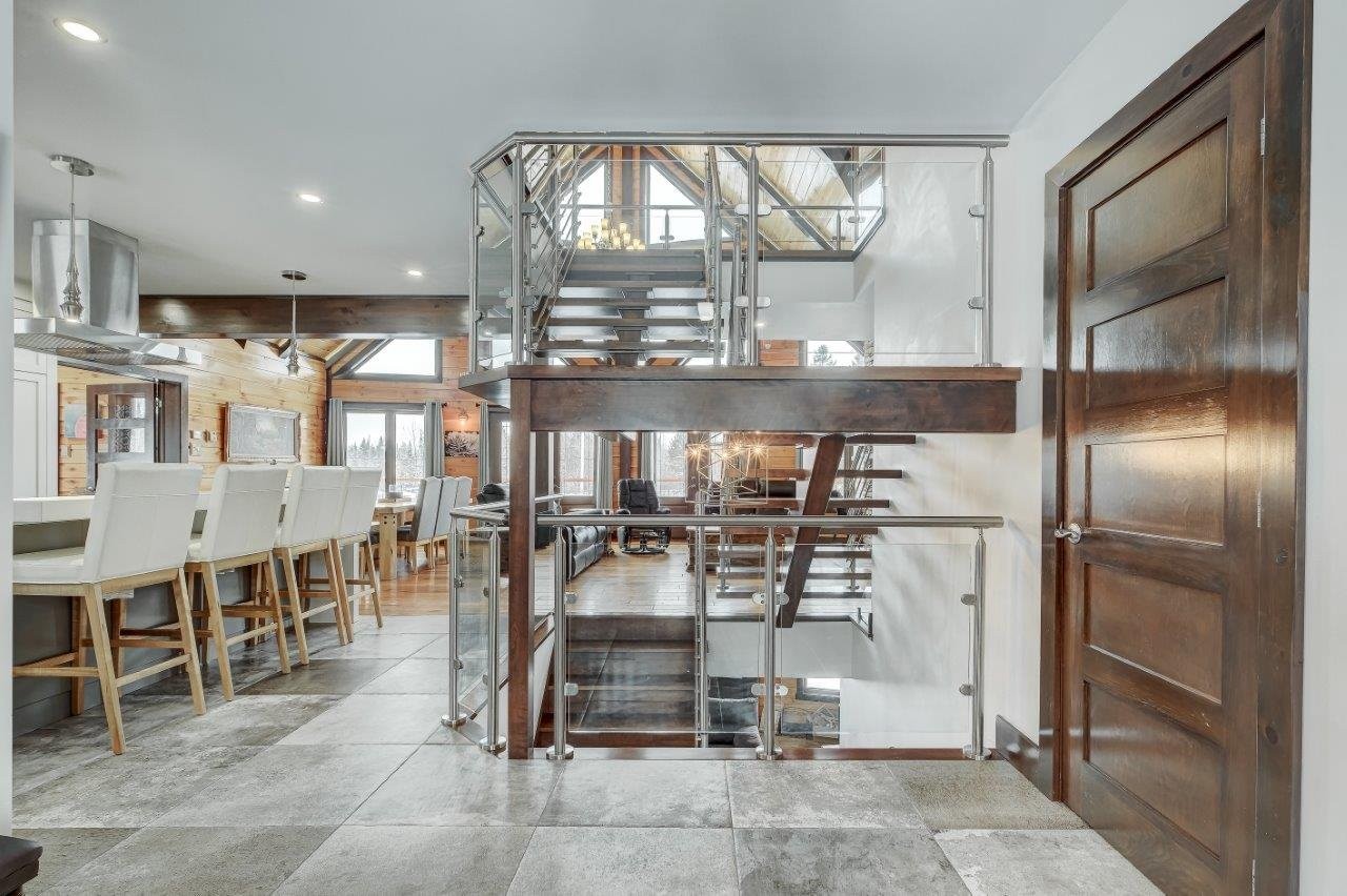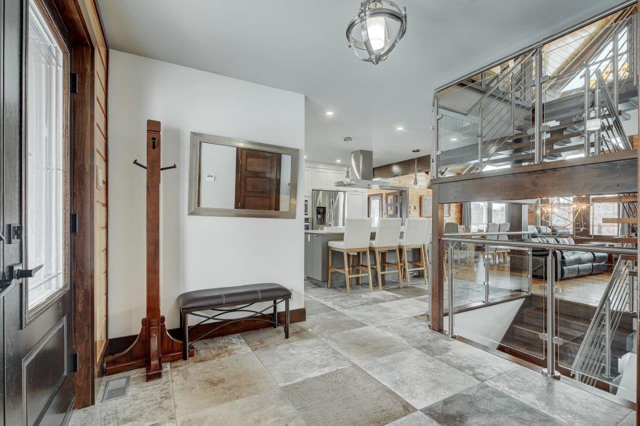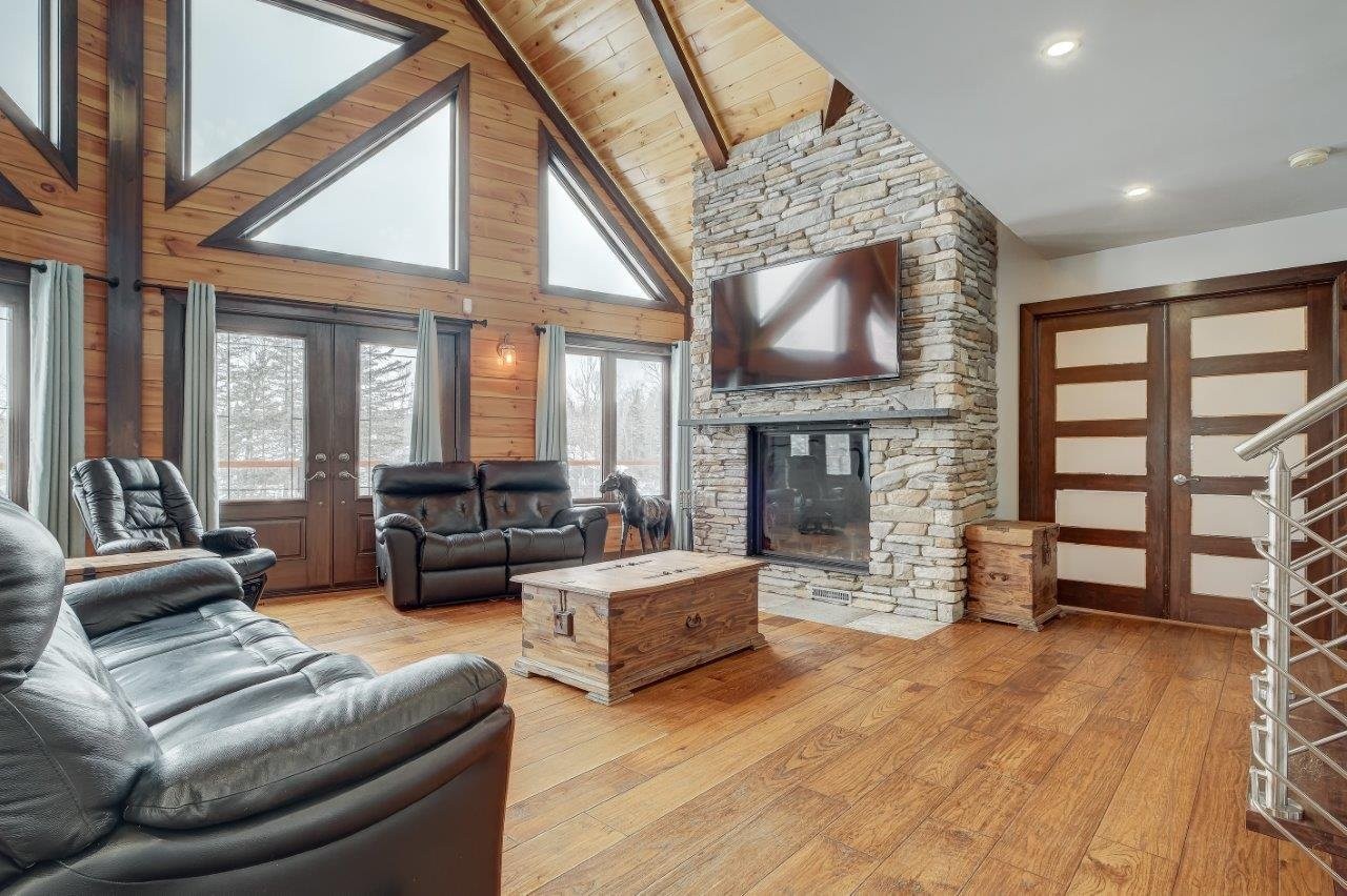 Construite en 2015, cette demeure se distingue par son design raffiné et ses finitions impeccables. Dès l’entrée, le salon à plafond cathédrale de 18 pieds impressionne par sa grandeur et son foyer en pierre à combustion lente qui réchauffe l’atmosphère. Les grandes fenêtres baignent l’intérieur de lumière naturelle, soulignant l’élégance et le confort des espaces de vie.